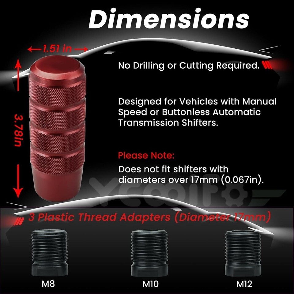 Universal Fit: Accompanied by 3 plastic ring accessories (8MM, 0MM, 2MM), compatible with most manual transmission vehicles including cars, trucks, buses, and SUVs. Note: Not suitable for gear shift knobs with a lock button or pull-up ring.