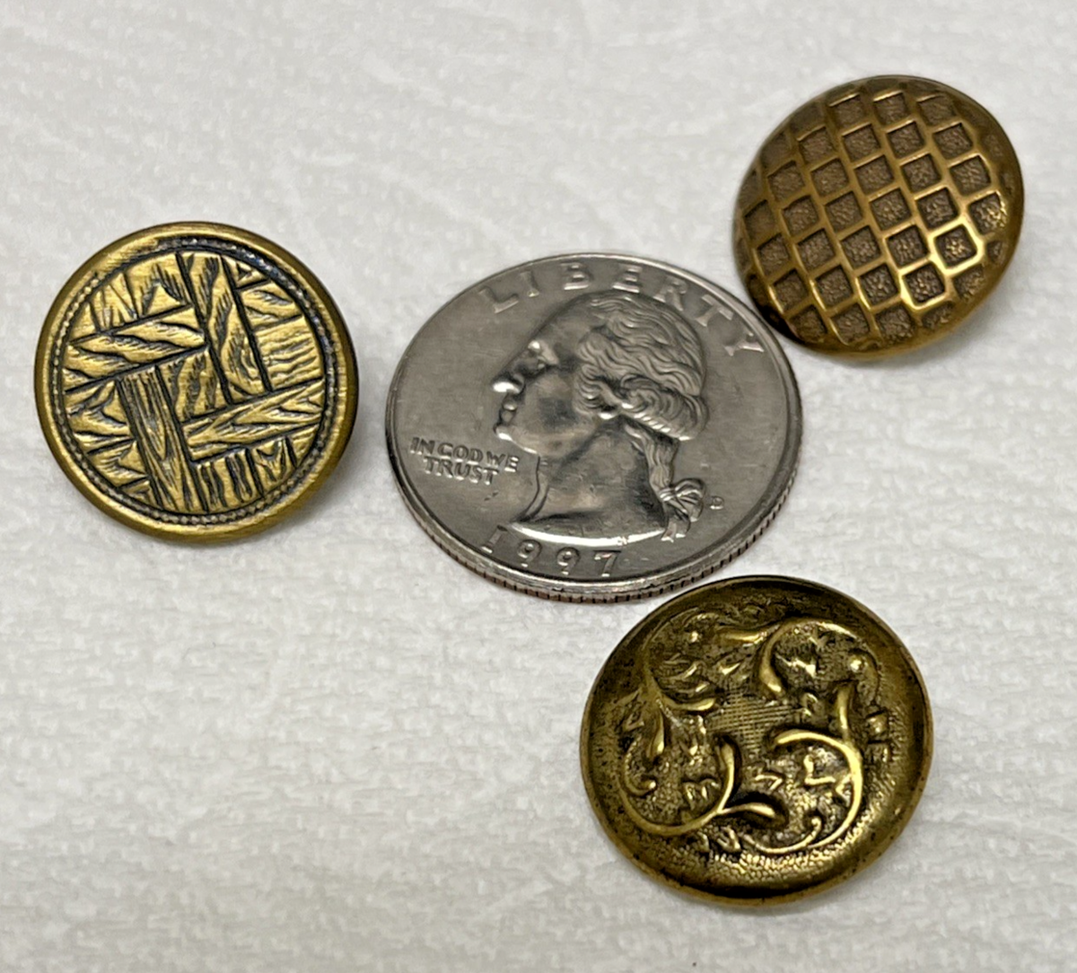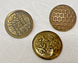 Primary image for 3 Antique Metal Buttons w Texture Design Wood Crisscross Feathery and Honeycomb