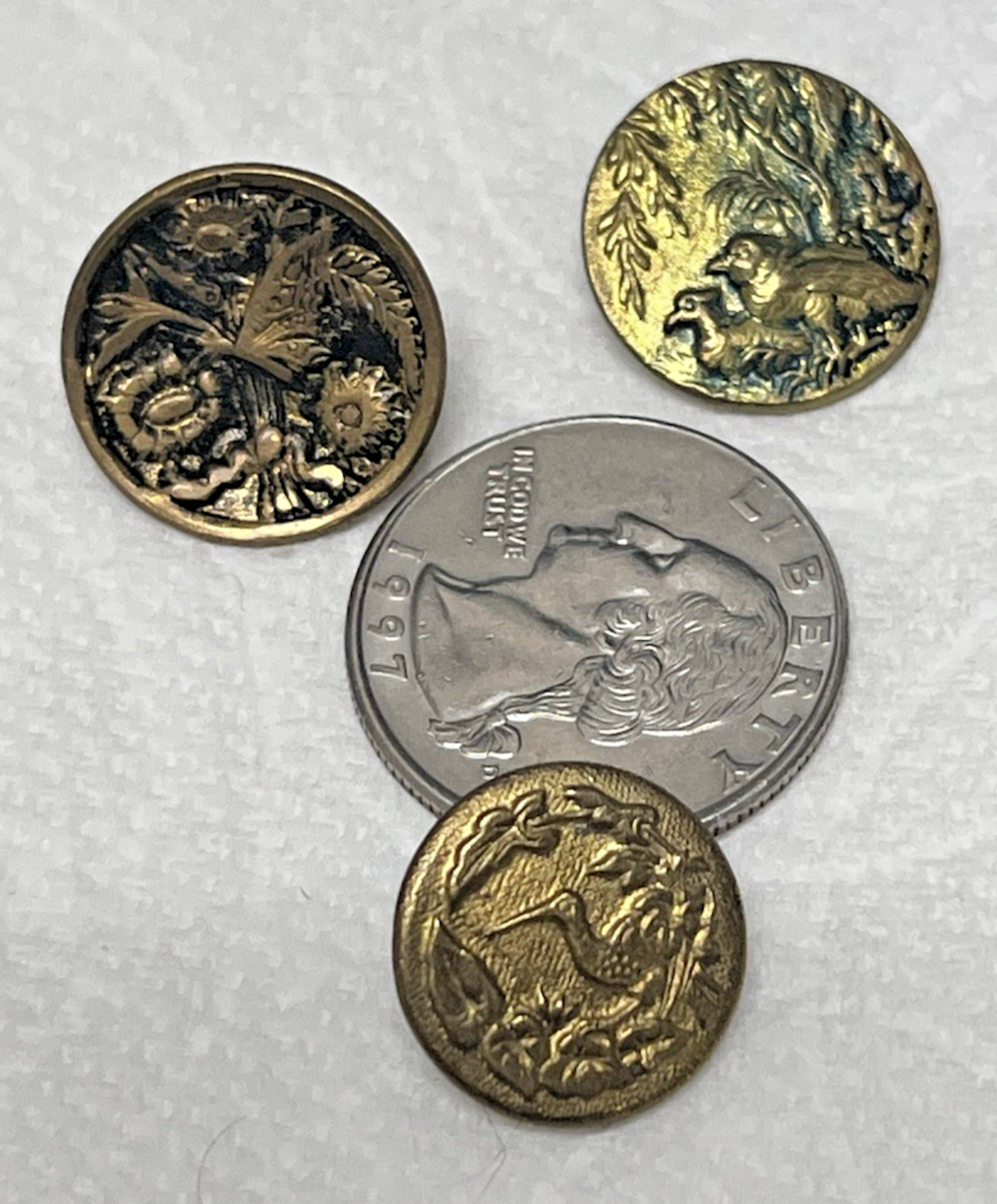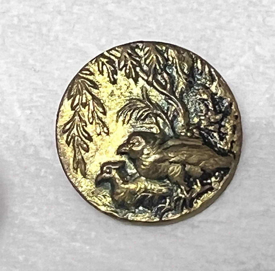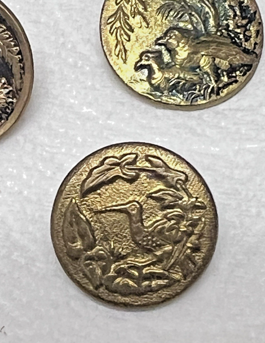 3 Antique Round Metal Picture Buttons Butterfly / Bird w Flowers More Birds 1 3/4 inch a butterfly or is it a bird with flowers Dark gold/coppery tone 2 2 partridges under trees with green highlights just shy of 3/4 inches 3 fun bird with long beak and leaves 5/8 inch
