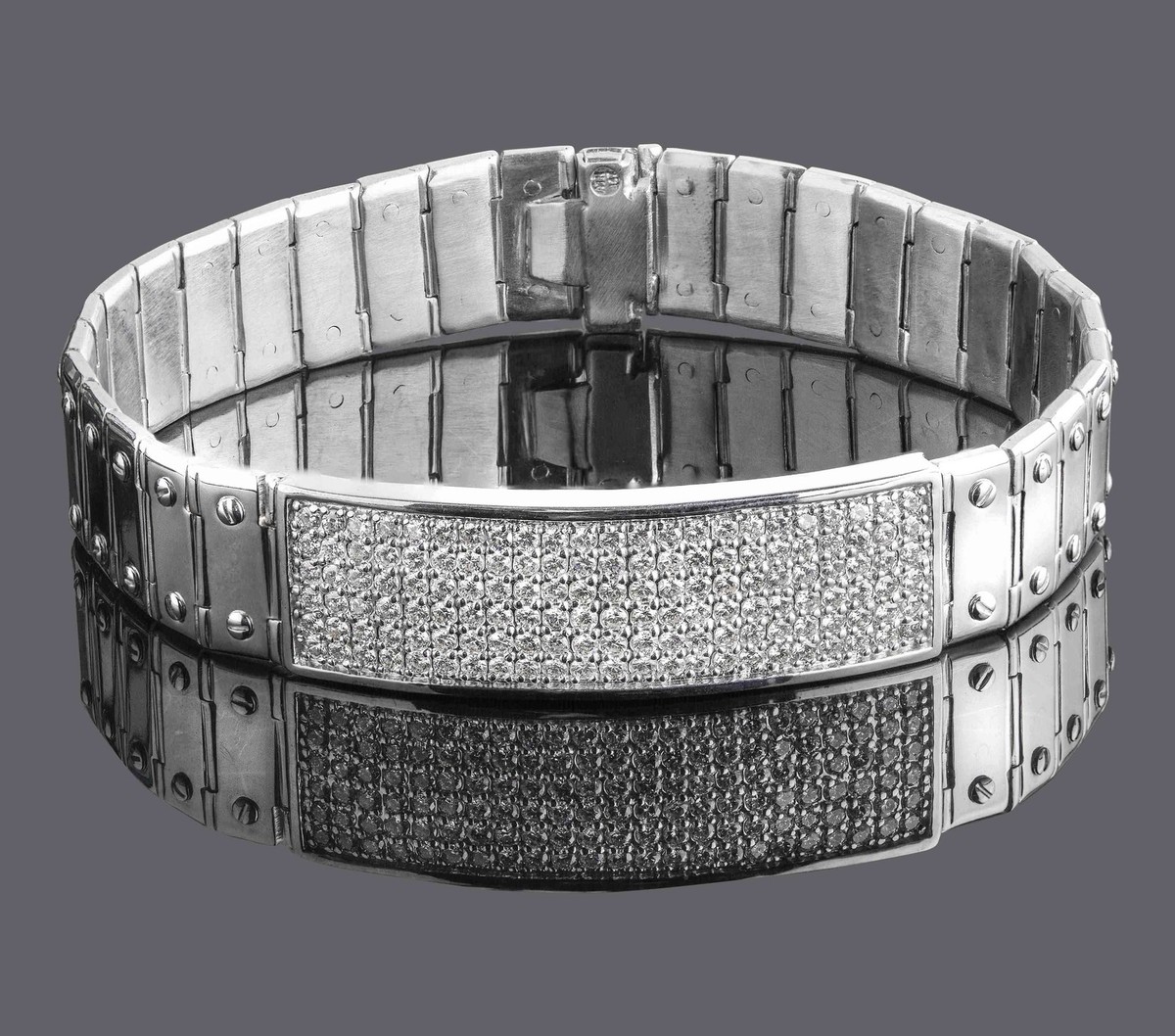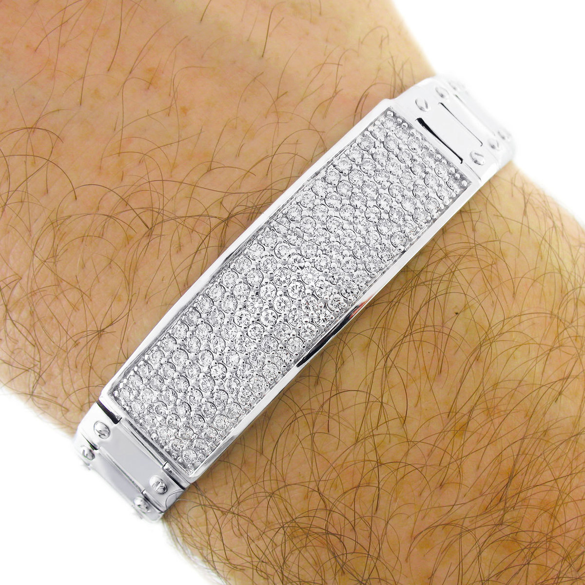 This perfect handcrafted id men's bracelet has been made with a careful eye to tiny detail. The bracelet is crafted from 14k solid white gold with screw details links and a plate that is encrusted with pave set round cut diamonds, totaling 3.00 carat. The bracelet measures 8.25 inches and encloses with a secure safety box lock and fold-over double safety clasp.