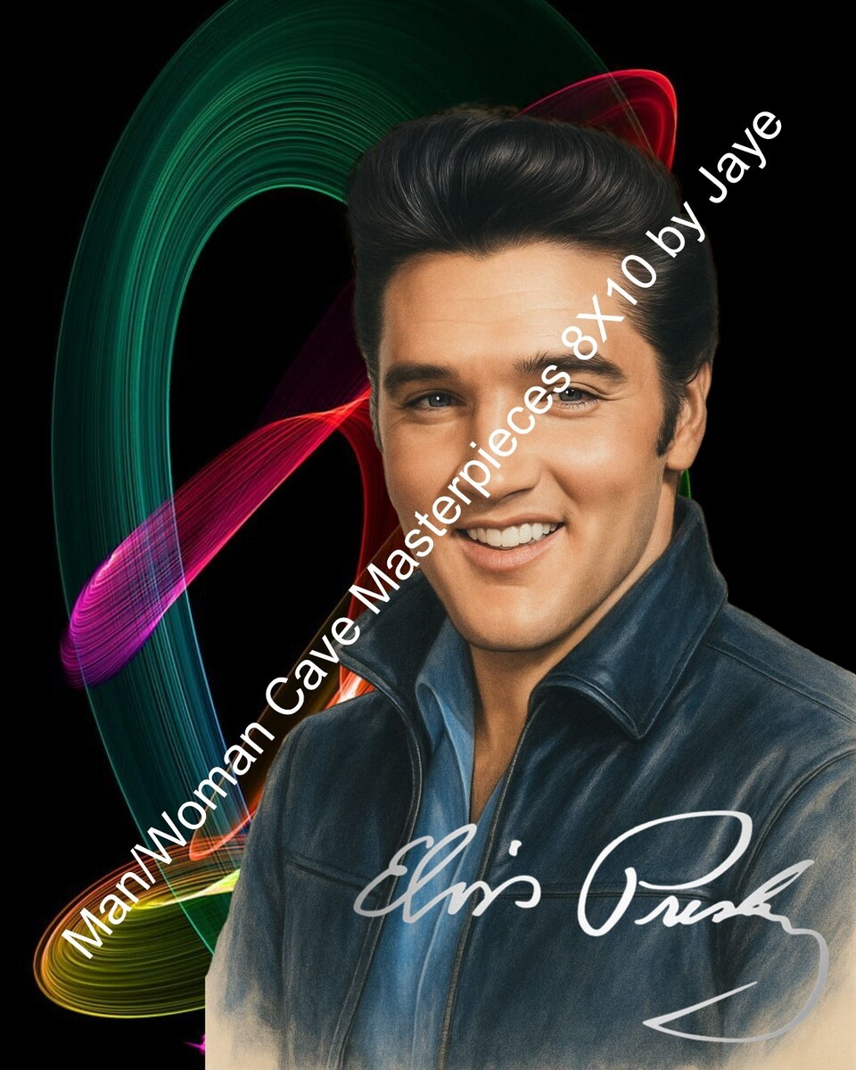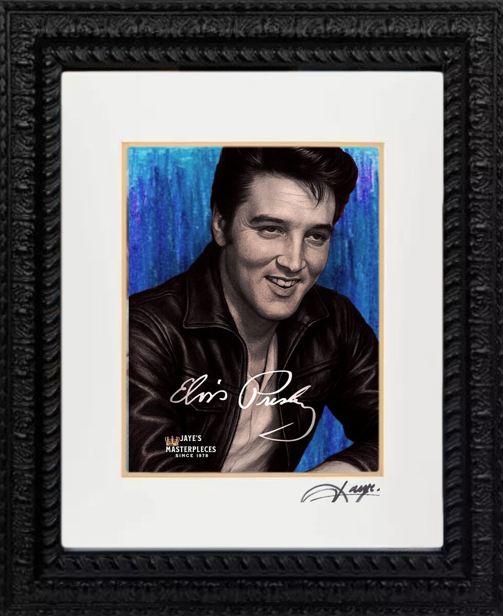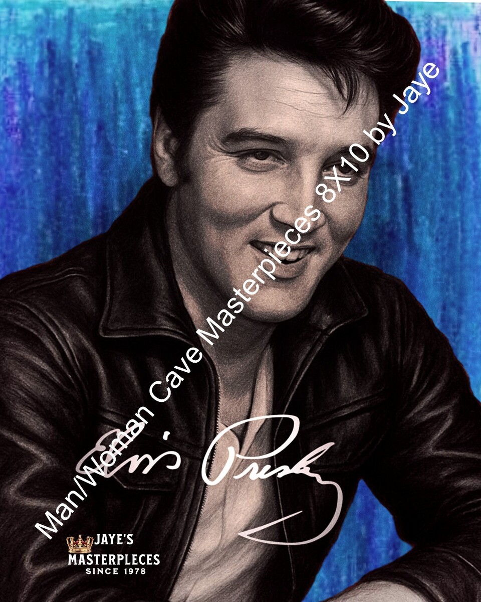 This product is a unique, hand-signed drawing of Elvis Presley from 1969, created by artist Jaye Metcalfe in Florida, USA. The 11x14 inch pencil drawing features a portrait of the celebrity in an Art Deco, Pop Art, and Outsider Art style. It is a one-of-a-kind (OOAK) piece framed and handmade by the artist, making it a special addition to any art collection. The drawing captures the essence of Elvis Presley's iconic look from the late 1960s, making it a valuable and distinctive artwork for fans of the legendary actor. Hand sign by the artist 8X10 Print 11X14 Frame Set of 3 frame prints.