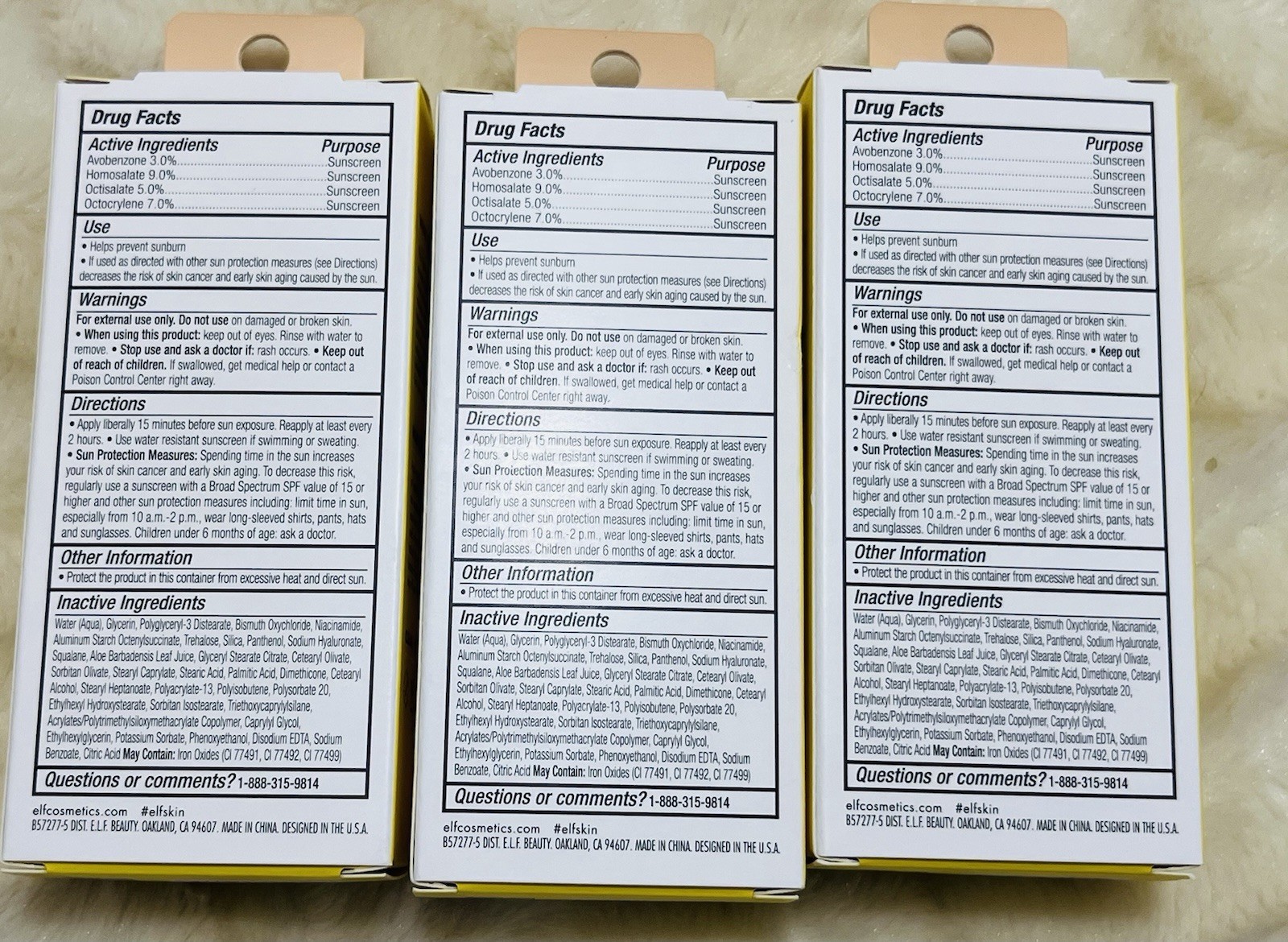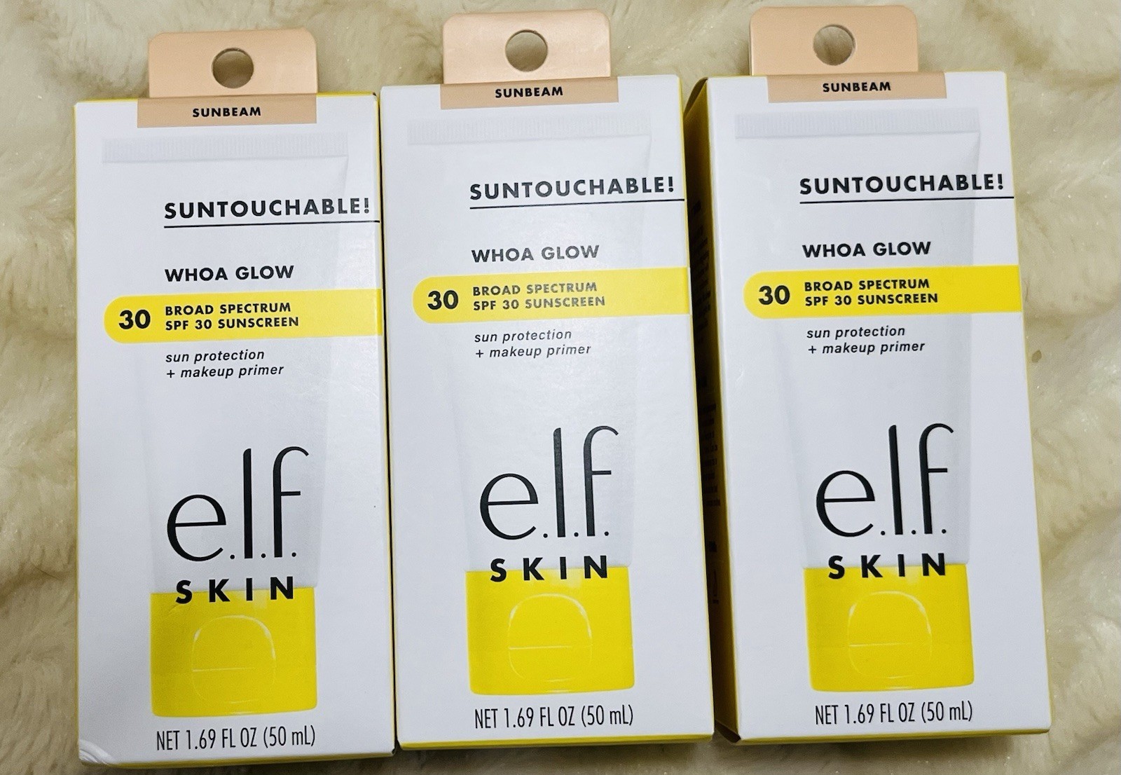 Set of 3 ELF SKIN Suntouchable! Whoa Glow SPF 30 Sun Protection + Makeup Primer Sunbeam What it is: A lightweight, broad-spectrum SPF 30 sunscreen that doubles as a makeup primer and leaves skin with a glowing radiance. Why you'll love it: Lightweight face sunscreen and primer with broad-spectrum SPF 30 Available in three shimmer finishes for a natural, radiant glow: sheer peach shimmer, sheer champagne shimmer (NEW!), and sheer bronze shimmer (NEW!) Non-greasy texture Doubles as a hydrating priming lotion to grip makeup for long-lasting wear Fragrance-free Ingredients: Aloe Hyaluronic Acid Squalane Prime, protect, and glow. This lightweight face sunscreen and primer hybrid delivers broad-spectrum SPF 30 sun protection, primes your skin for long-lasting makeup wear, and imparts a glowy, sheer finish. Now available in three flattering shades with just a hint of shimmer, the soothing and hydrating sunscreen formula has a non-greasy feel and is also infused with aloe, hyaluronic acid, and squalane. Use it as the last step in your skincare routine as a makeup primer, or wear on its own for a natural glow with a hint of radiance. The pictures are part of the description Please email with any questions prior to bidding I have other items in my store I prefer PAYPAL but will consider other forms of payment if you contact me before bidding. Please ask about combined shipping on multiple items. All items ship within 24 hours of cleared payment. We ship international. Please message with any questions before buying the item.