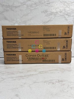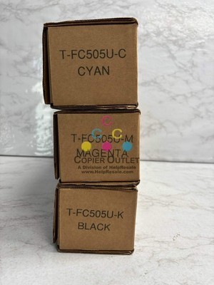 3 New Genuine Toshiba T-FC505U-CMK Cyan, Magenta and Black Toners (No Yellow) T-FC505U-C T-FC505U-M T-FC505U-K New Same Day Shipping For eStudio 2505AC, 3005AC, 3505AC, 4505AC, 5005AC isted By: Renee (Sales Team) ?if you really want to change...accept the challenge? -RRW (A positive moment brought to you by Help Resale) Copier Outlet (A Division of Help Resale) Copier Outlet was established in 1993. We buy and sell both domestically and internationally and have wide assortment of copiers, consumable and accessories of all popular brands. All of our copiers are in house and available for your inspection. They all have been tested and rated for functions, cosmetics and overall appearance. Our consumable and accessories selections include toners, imaging units, developers and copier parts such as fax board, fixing unit, fuser unit, roller, cleaning brush, drum blades and etc. For more detailed information on our copiers, consumables and accessories, please feel free to give us a call. We are more than happy to assist you with the pricing and guide you to find the copiers, consumable and accessories you wish to buy. Best Regards, Copier Outlet Sales Team Monday - Friday: 9:00 am to 5:00 pm (PST) Copier Clearance Center Promo Video - YouTube Video will open in a new windowUsing the App? Paste link into a browser window: [isdntekvideo] All product and company names are trademarksTM or registered trademarks of their respective holders. Use of them does not imply any affiliation with or endorsement by them.