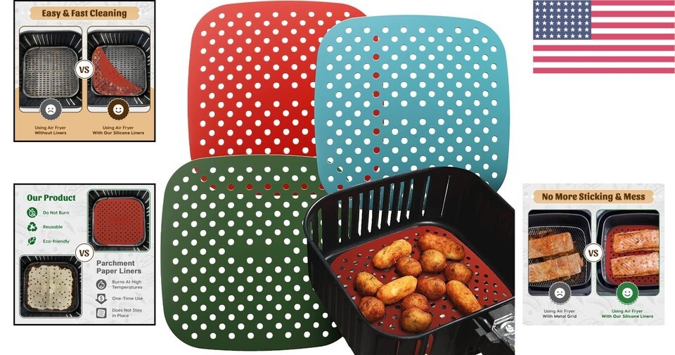 Primary image for 3-Pack Silicone Air Fryer Liners - 7.5'' Square with Cheat Sheet and Recipes