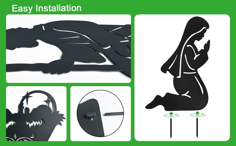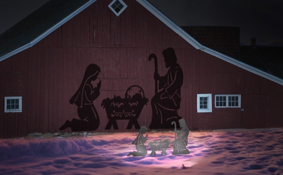 Celebrate the season with this beautiful shadow stake of the Nativity. Joseph, Mary and Baby Jesus are depicted as a black silhouette. At night, if you shine your own solar powered light at it then it will depict a beautiful shadow on your house. Stakes easily into the ground.