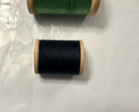 The product is a set of three vintage wooden cotton reels in green, brown, and blue colors. These reels are made from cotton material, providing a classic and durable option for sewing projects. The unique colors add a touch of nostalgia and charm, making them a desirable addition for collectors or sewing enthusiasts looking to add a vintage flair to their collection.