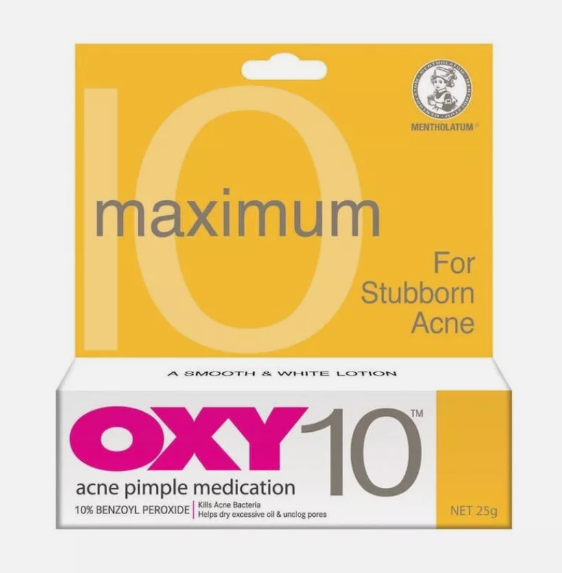 OXY 10 acne pimple medication contains 10% Benzoyl Peroxide to treat the more stubborn pimples/acne that do not respond to mild acne treatments. Kills acne bacteria that causes pimples. Helps dry up excessive oil. Helps unclog pores. Easy to use. Vanishes upon application.