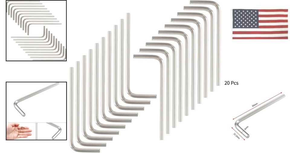 3 mm Hex Key Wrench, L-Shape Allen Key Metric, 20 Pcs Chrome Vanadium Steel