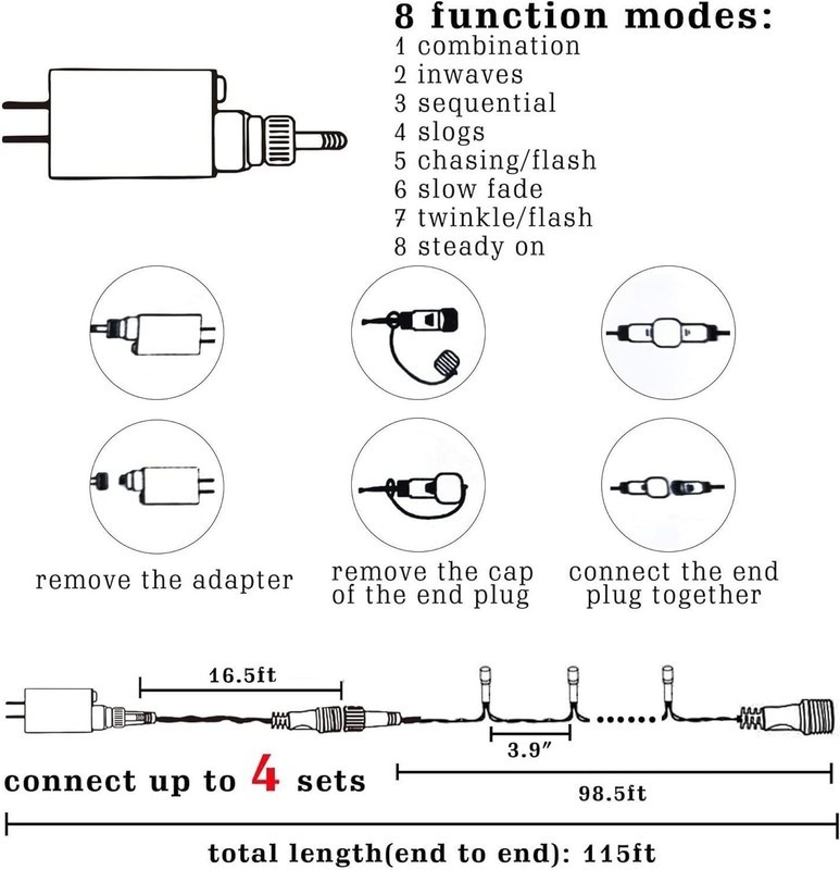 leading wire: 16.5 FT light string length: 98.5 FT total length: 115 FT bulb spacing: 3.9 inch lighting modes: 8 different modes Connectable: MAX 1200 LED 29V low voltage IP44 waterproof