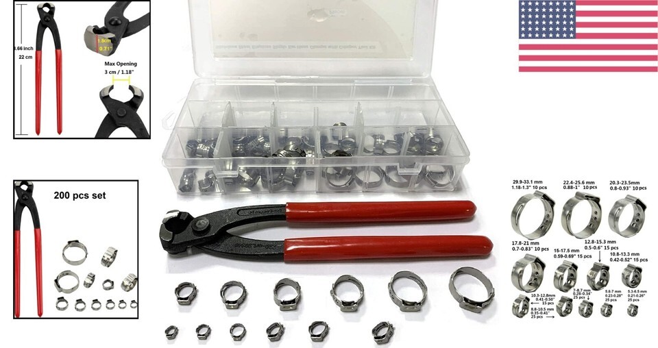 - 304 Stainless Steel Hose Clamp Set with Crimping Tool | 200 Pcs Assortment