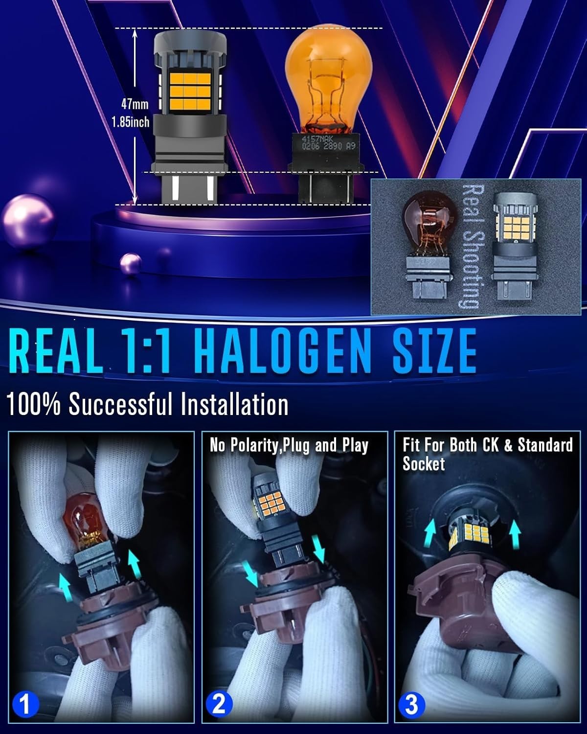These amber 3156 led blinker bulb are real 1:1 size with the factory bulb, ensuring successful installation in all of the vehicles.Thanks to the 1:1 size and non-polarity design, these 3457 led blinker bulb installs exactly like the factory bulb. No drilling, no wiring, no damage, just Plug and Play