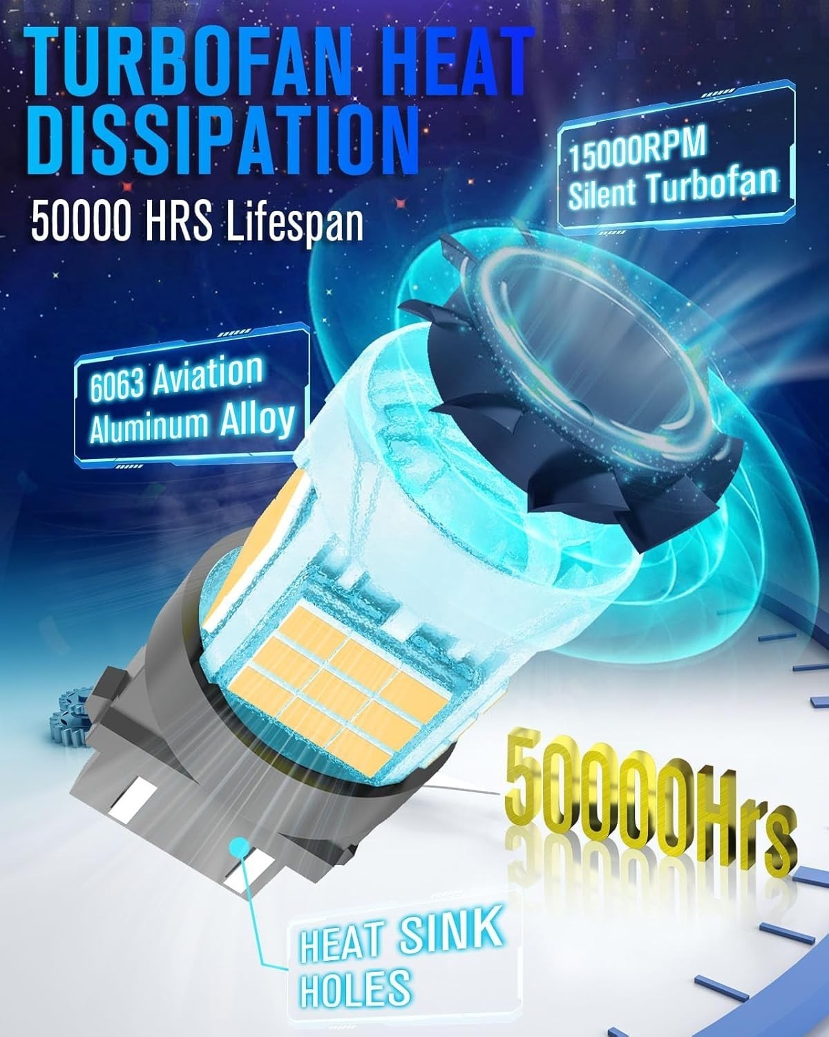 These 3157na turn signal bulbs are designed with aviation aluminum body, high-speed turbo fan and hollow design, which provide superior heat dissipation capacity and greatly extends the 3057 led bulbs' lifespan up to 50,000 hours. Avoid frequent replacement