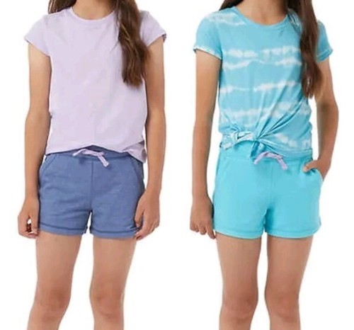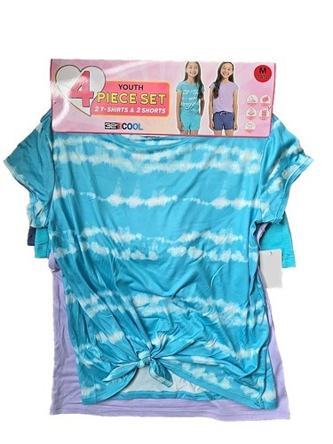 This Sale is For a 32 Brand Four (4) Piece Set Girls' Size Medium (10/12) Inseam measures approximately 3" Aqua/Purple in Color Includes: Two (2) Short Sleeve Tees ~ 93% Polyester ~ 7% Spandex Two (2) Shorts ~ 74% Polyester ~ 21% Rayon ~ 5% Spandex Raglan sleeve tops Soft hand feel Quick dry Stretch comfort Breathable Easy care Machine wash ~ Tumble Dry Set is new in the original packaging Please view photos for a good description of this item Thank you!