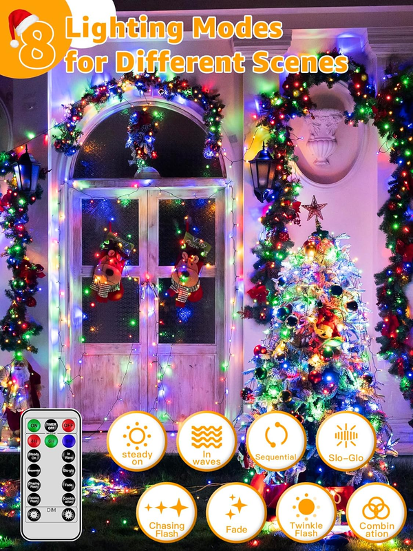 8 Lighting Modes: The Christmas lights for tree has 8 lighting modes; (Steady ON, In Wave, Sequential, SLO-GLO, Chasing Flash, Fade, Twinkle Flash, Combination)