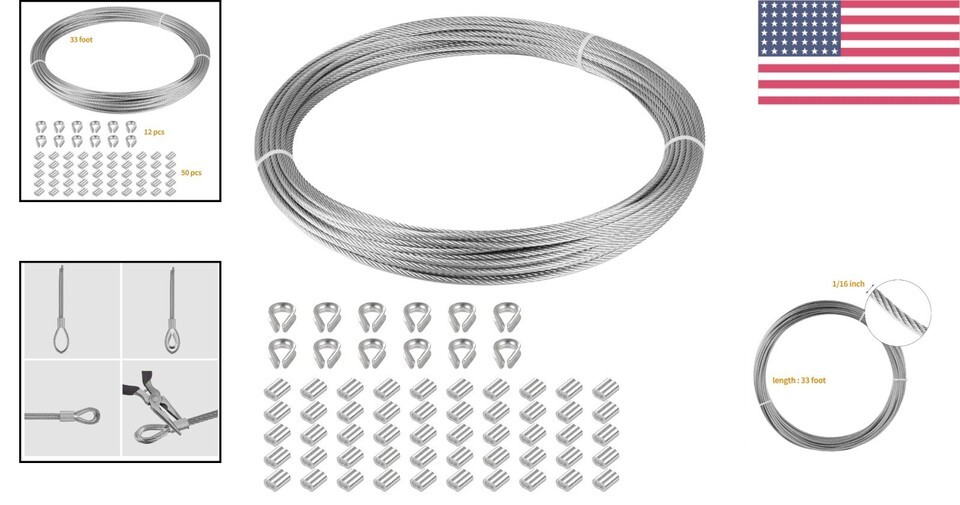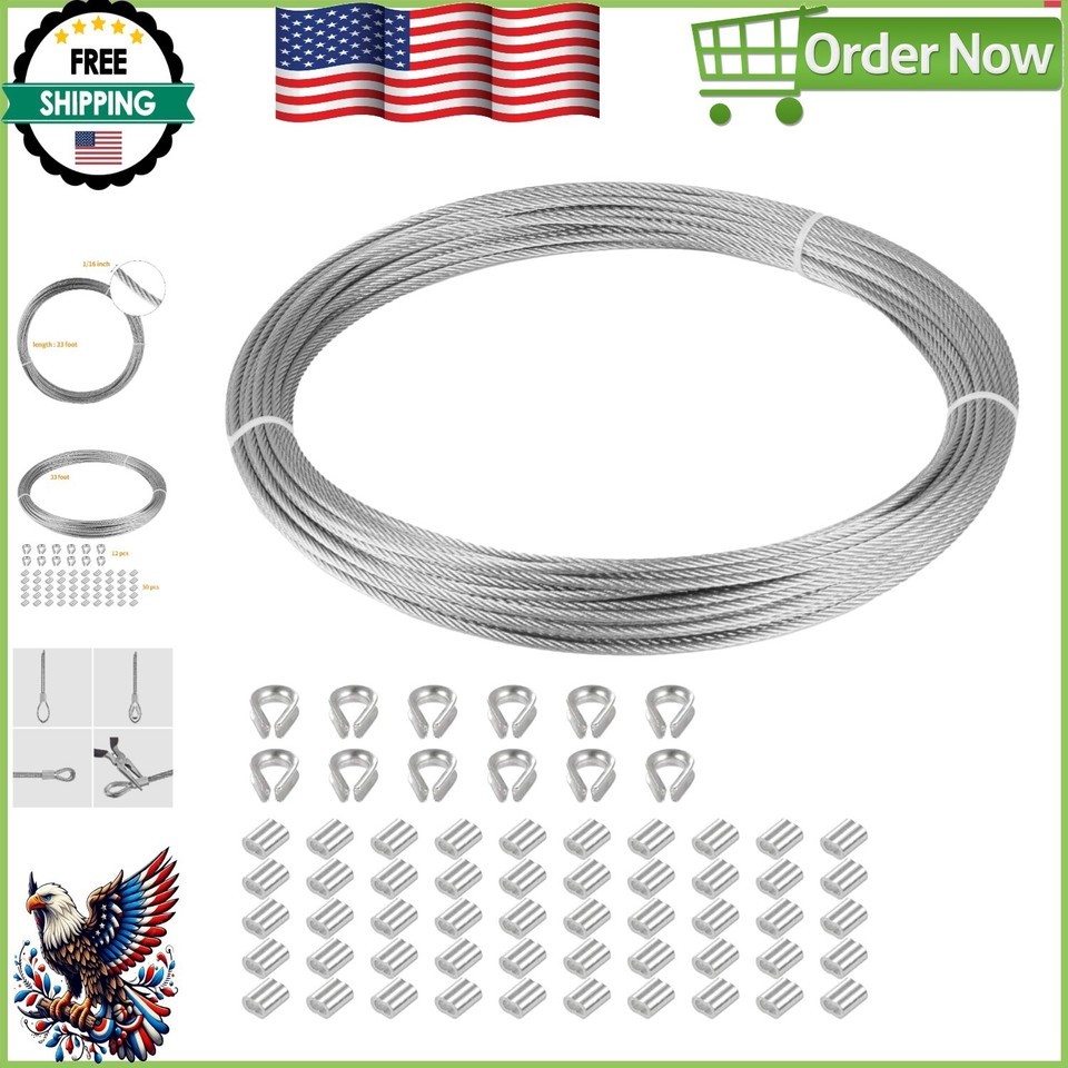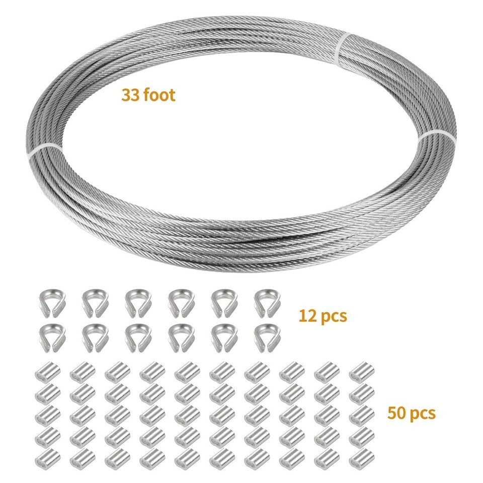 33 FT Marine Grade 316 Stainless Steel Cable 1/16" with 50 Sleeves & 12 Thimbles