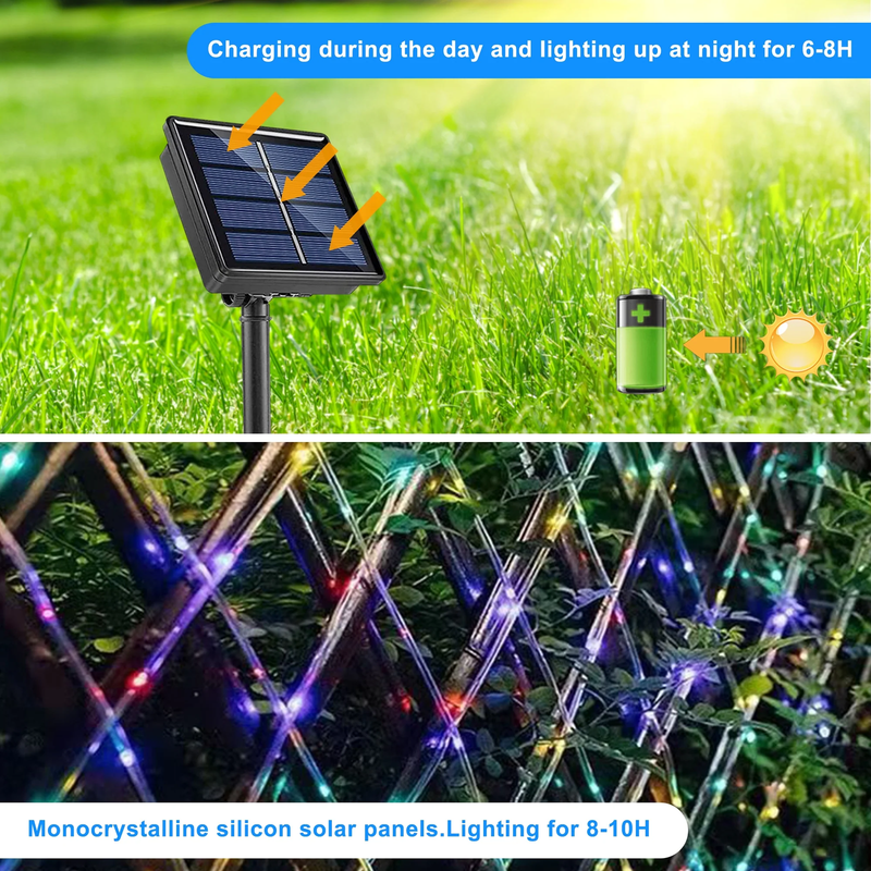 Energy-Saving:Solar rope lights through solar panels collect and store solar energy, high-quality solar power. No batteries to replace and no extra electricity costs to pay. Absorb solar energy during the day, turning it on at night. The battery can continuously work for 6-8 hours when fully charged.