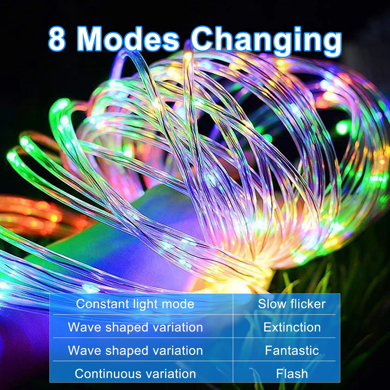 IP65 Waterproof:Solar rope lights Outdoor Waterproof Led wrapped by PVC clear tube (diameter 5mm) and also frost-proof, and sun-proof and can be used in all kinds of weather. With outer protection, you don't worry about the problem that the fairy lights inside are easy to break and easy for critters to chew through. It is more durable than other ordinary solar rope lights, It is a perfect choice for indoor and outdoor decorations.