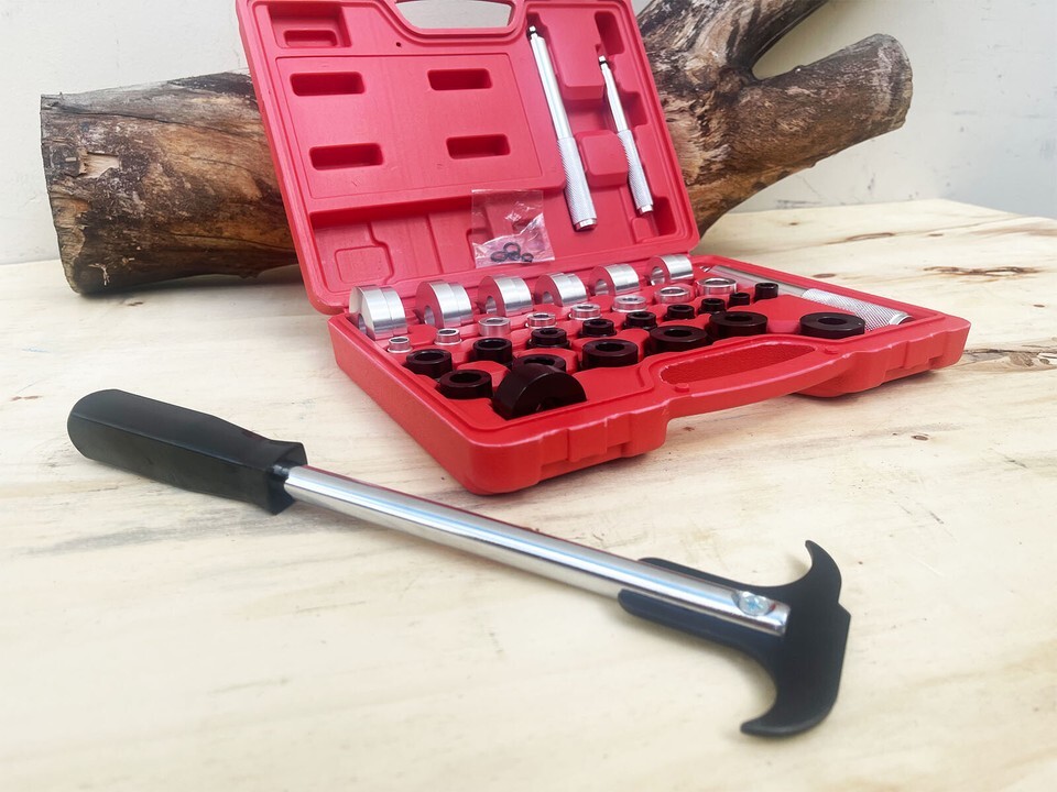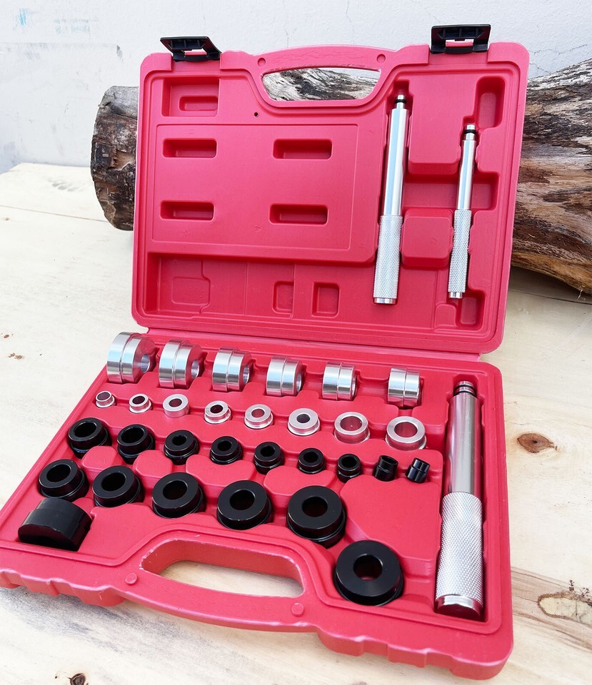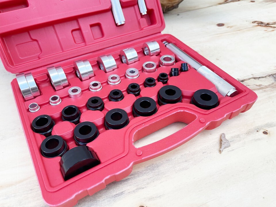This Master Bushing Driver 33-Piece Set ? Metric Standard SAE Bushing, Bearing, Seal Removal Installation Tool Kit and 1pc Oring Seal Puller enables you to remove and install bushings ranging from 10mm to 42mm in diameter and 3/8 inch to 1-3/8 inches in diameter. With this kit, you can complete all of your general pressing needs, install select bushings during a transmission rebuild, freeze plugs, replace a bushing under a rear wheel next to the shock without having to remove the entire knuckle, install pilot bearings, bicycle wheel small sealed bearings, and more. The tool can be reversed to be used as a seal driver but is not recommended for a control arm bushing or other suspension parts. Simply use the different adapters to press (or gently hammer) in/out the bushing/bearing/seal.