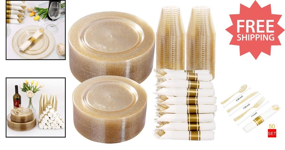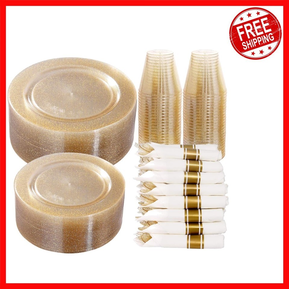 350-Piece Gold Glitter Party Set - Dinner Plates, Napkins Cups for 50 Guests