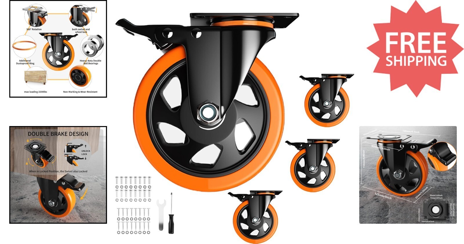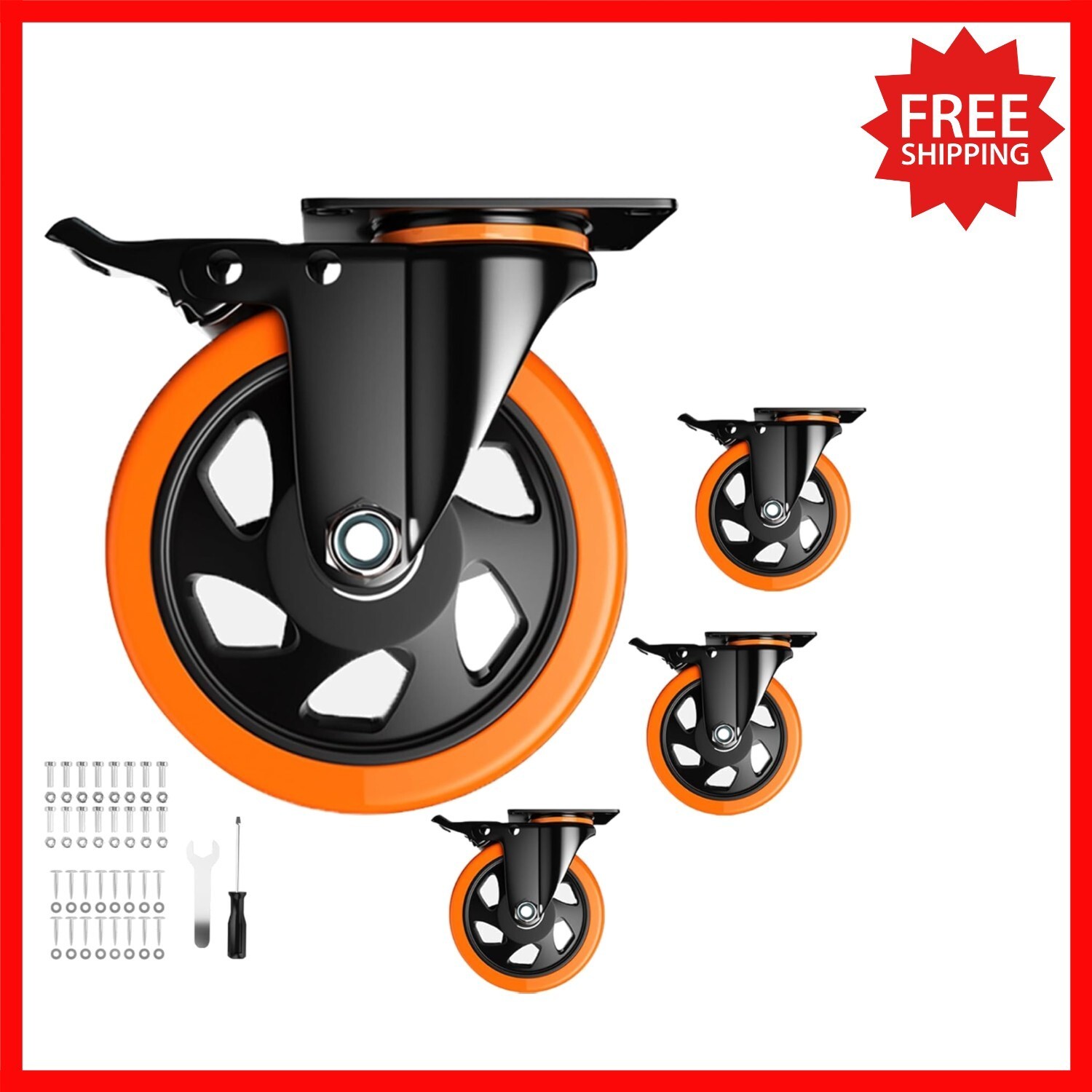 Upgrade your mobility with our Heavy-Duty Castors Set of 4, crafted from thick stainless steel with a double ball bearing design for durability and resistance to dirt. Each caster can support up to 550lbs, with the entire set capable of transporting up to 2200lbs safely and quietly. The 5-inch wheels offer 360-degree rotation for maximum flexibility and smooth, non-marking polyurethane rubber tires that absorb shock, resist wear, and roll seamlessly on all floors. Equipped with robust safety brakes, these casters lock both the wheel and swivel easily, ensuring stability when needed. Ideal for industrial and residential use, they are perfect for furniture, trolleys, cabinets, and more. Installation is straightforward with our included hardware kit and screwdriver, compatible with wood, steel, or plastic surfaces. To ensure fast and reliable delivery, we work with multiple fulfillment partners and suppliers. Depending on availability and location, your order may ship from different warehouses or arrive in packaging that varies from item to item. Tracking details are typically provided shortly after shipment, and customer satisfaction remains our top priority. Please note that due to carrier policies and regional regulations, certain items may not be eligible for delivery to specific states or territories.