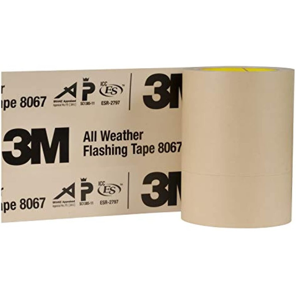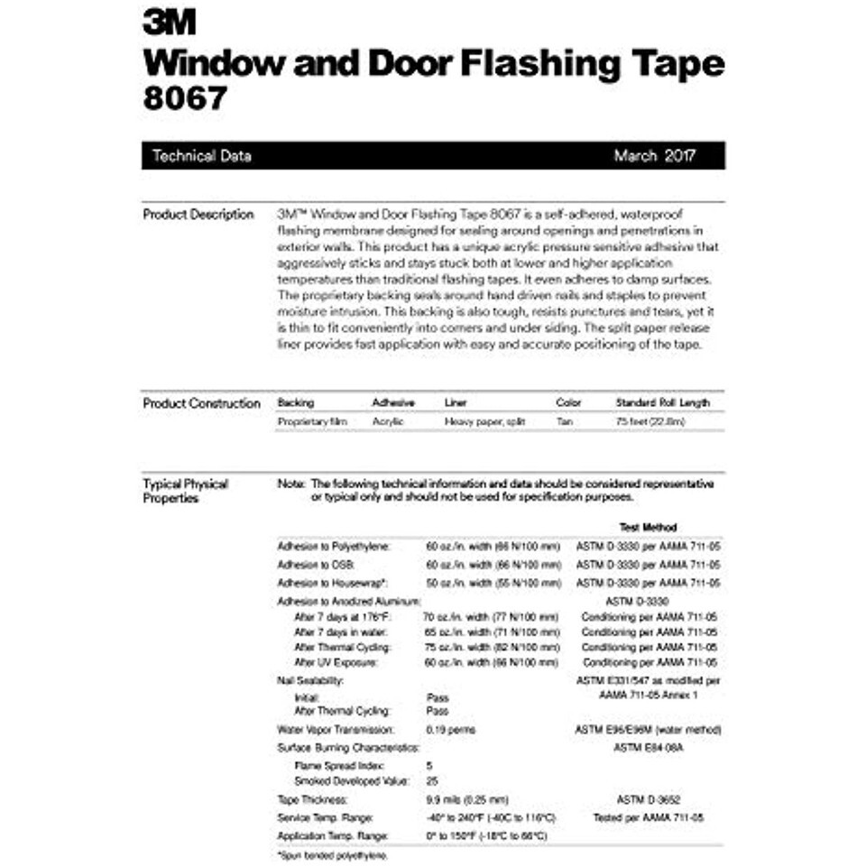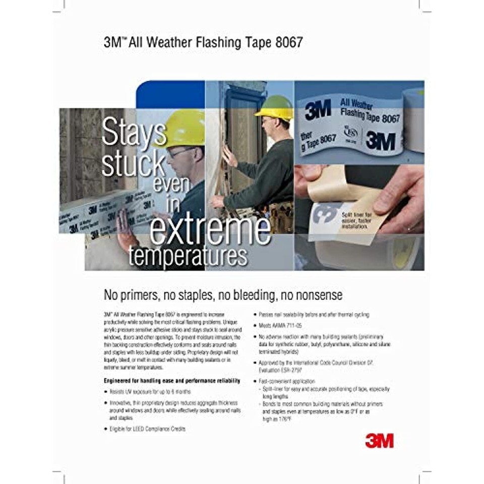 3M All Weather Flashing Tape 8067 is a self-adhered, waterproof flashing membrane designed for sealing around openings and penetrations in exterior walls. This product has a unique acrylic pressure sensitive adhesive that aggressively sticks and stays stuck both at lower and higher application temperatures than traditional flashing tapes. It can be applied to materials without primers or staples and bonds in surface temperatures from 0 to 176F (-18 to 80C) per AAMA 711-05. It even adheres to damp surfaces. To prevent moisture intrusion, the thin backing construction effectively conforms and seals around nails and staples with less buildup under siding. This backing is also tough, resists punctures and tears, yet it is thin to fit conveniently into corners and under siding. Proprietary construction will not liquefy, bleed, or melt in contact with many building sealants or in extreme summer temperatures. The split paper release liner provides fast application with easy and accurate positioning of the tape Recommended applications include: sealing joints around sills, jambs and heads of rectangular windows in wood frame construction; sealing around other wall interruptions in non-roof areas, such as thresholds, dryer vents and hose bibs; when installed properly as a concealed flashing in vertical walls in frame construction, it prevents moisture intrusion or water leaks and avoids the costly problems caused by water infiltration.