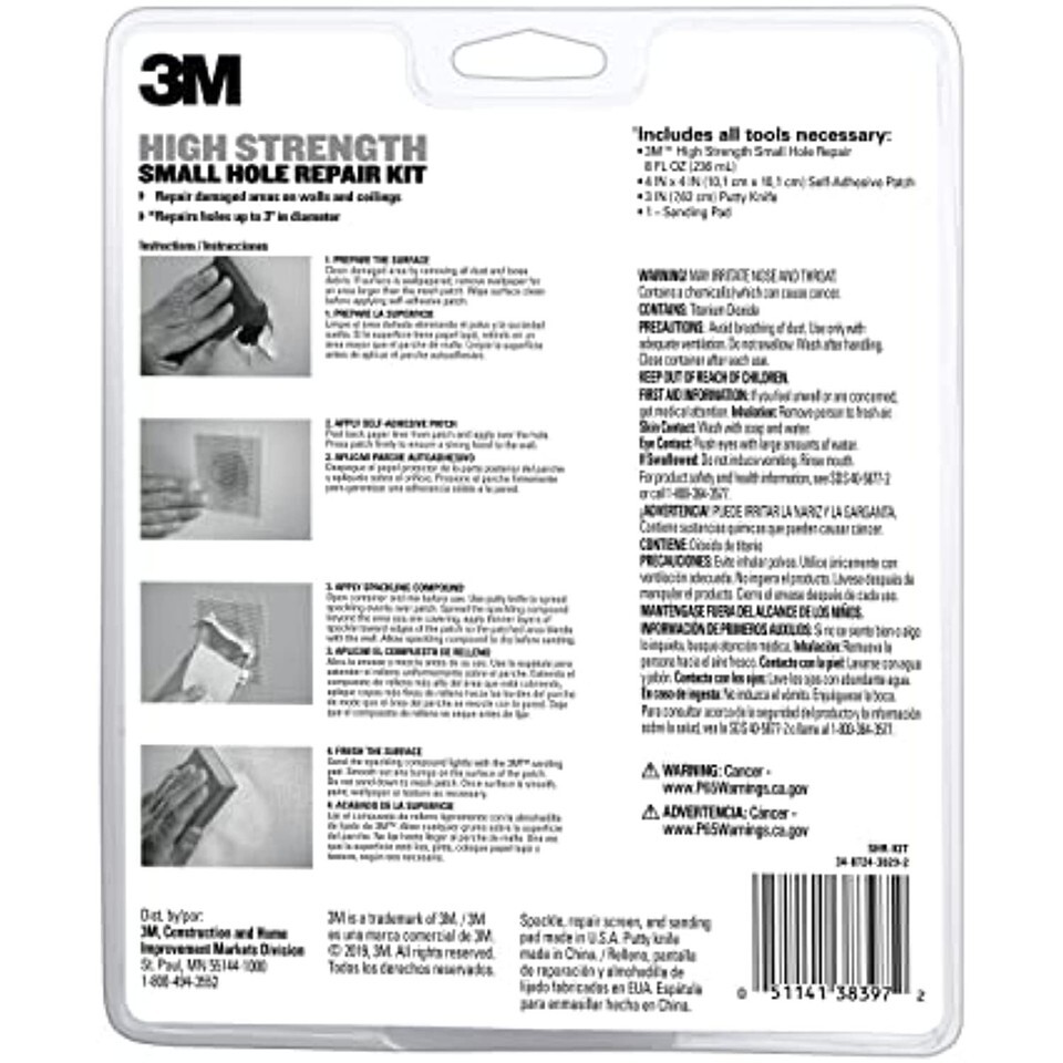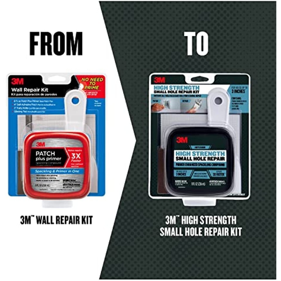 Product Description 3M High Strength Small Hole Repair Kit includes all necessary tools for a interior small hole repairs up to 3". Kit includes 3" putty knife, primer enhanced spackling compound, 4" drywall repair screen and sanding pad. From the Manufacturer The 3M Wall Repair Kit contains all the tools necessary to make wall repairs easy with great results. 3M Patch plus primer is a spackling primer in one, so there is no need to prime!