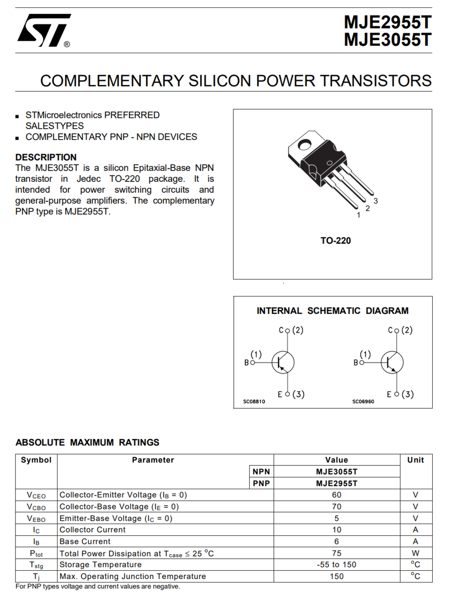 3 Pieces - MJE3055T STMicroelectronics NPN Power Transistor 60V 10A 75W TO-220
