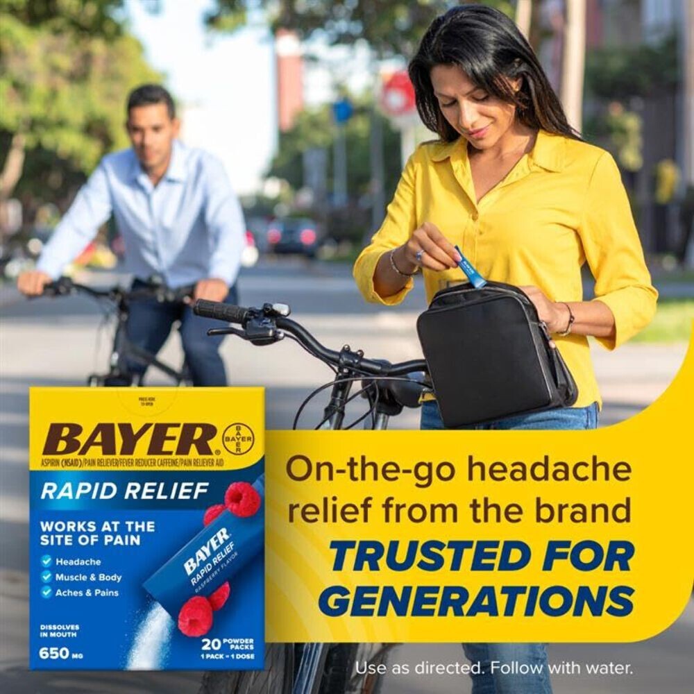 3x Bayer New Rapid Dissolvable Raspberry Flavor Powder Packs with Aspirin Caffeine 3 Packs Expiration Date of 5/2026 ? DISSOLVABLE FAST PAIN RELIEF: NEW Bayer Rapid Relief provides pain relief at the tip of your tongue. A single Bayer Rapid Relief powdered aspirin pack provides rapid pain relief that gets to work as hard as you do ? WORKS AT THE SITE OF PAIN: With active ingredients aspirin and caffeine, Bayer Rapid Relief works at the site of pain to relieve headache pain, muscle pain, back pain, menstrual cramps, minor arthritis pain, and helps to reduce fever ? RIP IT, TIP IT, RELIEF: To use, simply shake contents of individual pack, tear at the arrow, pour the powder on your tongue, and follow with water ? GREAT TASTE: Bayer Rapid Relief powder packs provide on the go pain relief with a great taste ? FROM THE ORIGINAL ASPIRIN BRAND: Bayer Aspirin provides fast pain relief for headaches and back and body pain ? Use as directed (description exceeds maximum possible length)