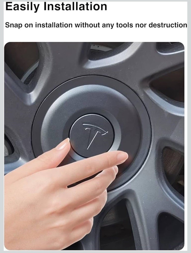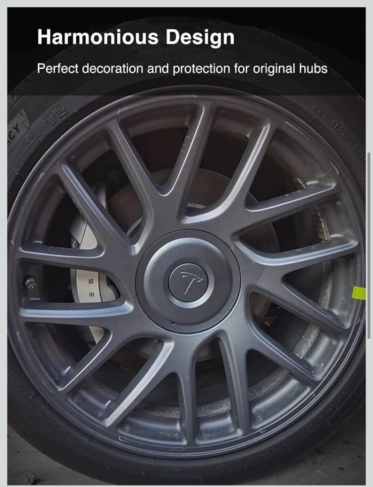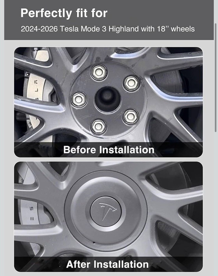 The product is a set of four 18-inch wheel center hubcaps center caps designed specifically for Tesla Model 3 Highland 2024-25. Made of ABS material with a matte gray finish, these wheel center caps are easy to install and are designed to fit lower on the vehicle. The Tesheer brand ensures quality and compatibility with 18-inch wheels, providing a sleek and stylish look for your Tesla.