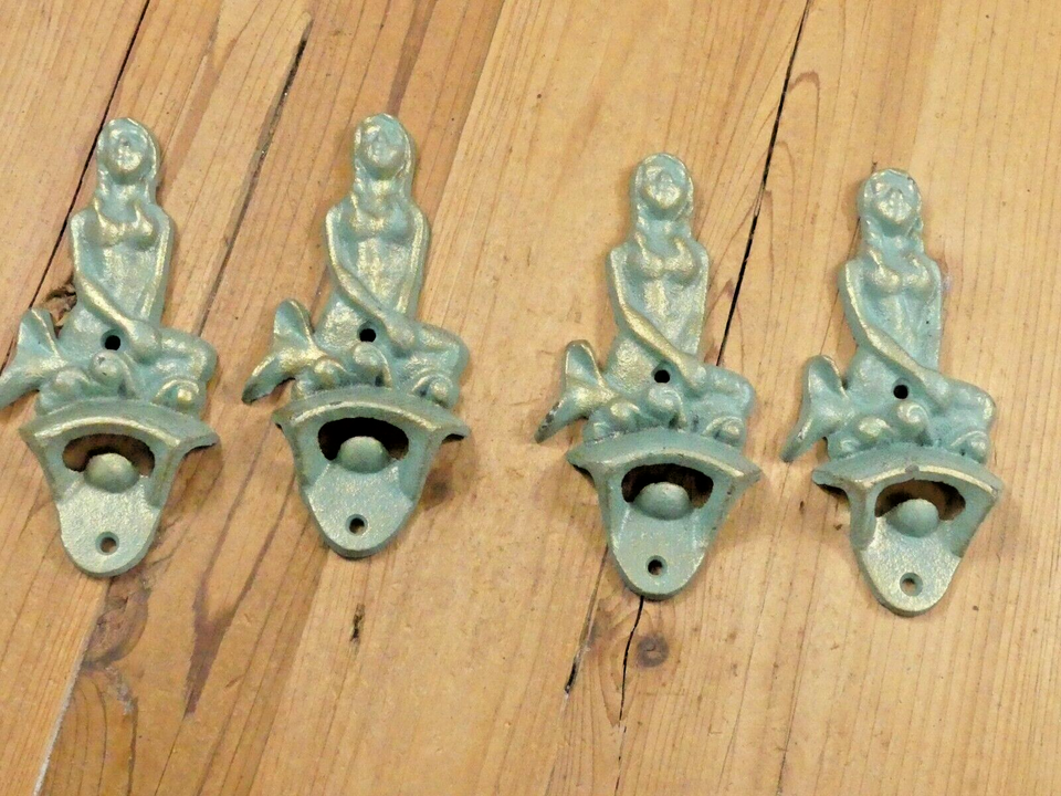 PLEASE BE AWARE THERE ARE SOME CHIPS IN THE PAINT! PLEASE SEE PICTURES! 4 CAST IRON MERMAID BOTTLE OPENERS! SALE INCLUDES 4! CAN BE EASILY MOUNTED THE WALL! SHIPPED OUT WITHIN ONE BUSINESS DAY, SO YOU CAN ENJOY FAST! FREE SHIPPING!