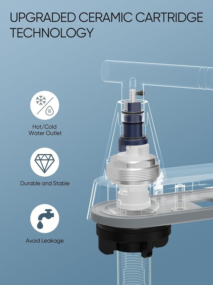Features: 360 Swivel,Lead Free,Water Saving System,360 Swivel Spout,Rotating Lever Handles,Hot and Cold Water Control,Easy Flow Adjustment,High Arc Nozzle,Ceramic Valve,Advanced Water Control System,Pop-up Drain with Overflow,Built-in Strainer