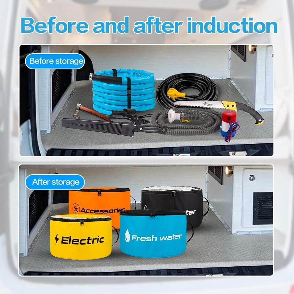 Say goodbye to tangled hoses and disorganized cables! Our 4-Pack Waterproof RV Storage Bags combine functionality with sophistication. Designed with your convenience in mind, these bags offer ample space, targeted organization, and easy identification, ensuring that you can enjoy your travels without the stress of clutter.