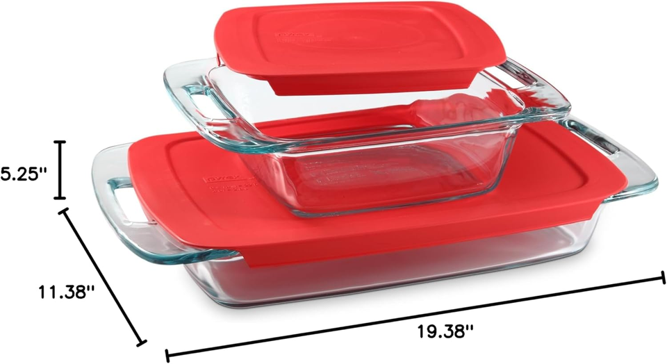 This set of glass baking dishes will quickly become your trusted kitchen staple, with two versatile sizes for all your sweet and savory favorites. With durable Pyrex glass and large easy-to-hold handles, your dishes can easily move from counter to oven to table or freezer. The 2-quart is just the right size for side dishes, gratins and brownies, while the essential 3- quart holds everything from larger baked pastas, make-ahead casseroles for the freezer and party-sized desserts to share. Plus, the convenient lids let you store leftovers or carry food to a gathering.