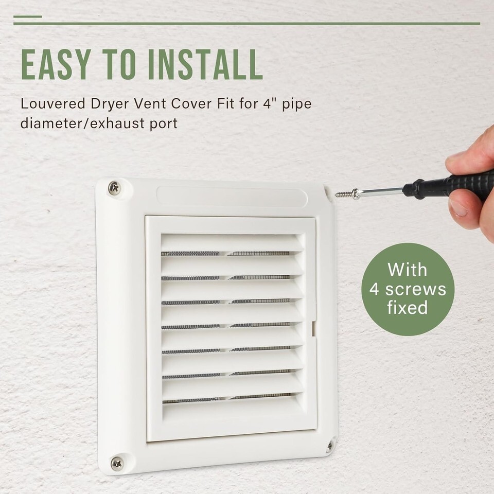 4" Plastic Louvered Vent Cover (6" x 6") Outdoor Dryer Exhaust Cap with Screen, White, Includes 4 Screws