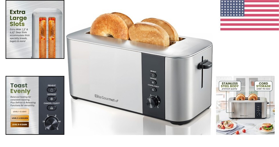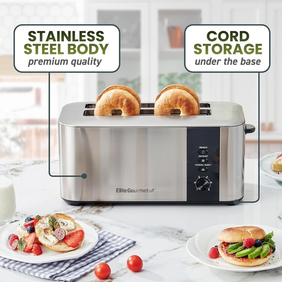 - 4-Slice Extra Large Toaster with Reheat & Defrost Functions in Stylish Steel