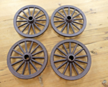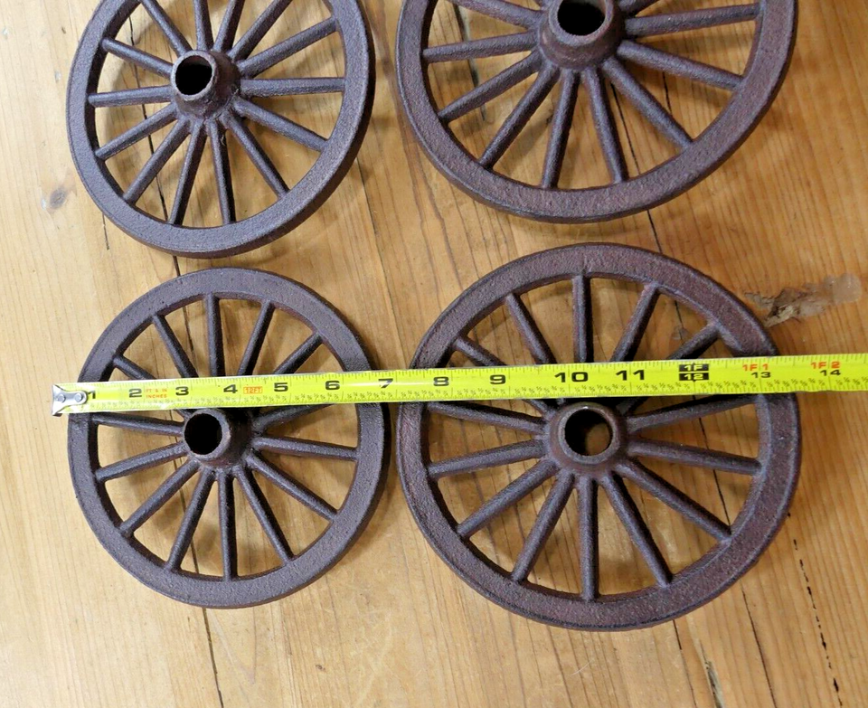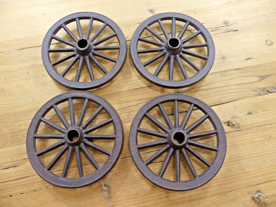 4 MINATURE RUSTIC CAST IRON WAGON WHEELS! SALE INCLUDES 4! RUSTIC LOOK! NEW MADE TO LOOK OLD! 6 3/4" DIAMETER! CENTER HOLE IS 3/4" WIDE! SHIPPED OUT WITHIN ONE BUSINESS DAY, SO YOU CAN GET FAST! FREE SHIPPING!