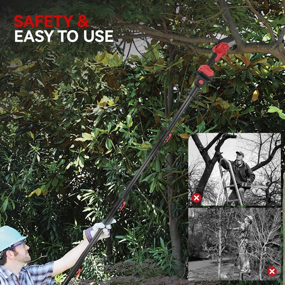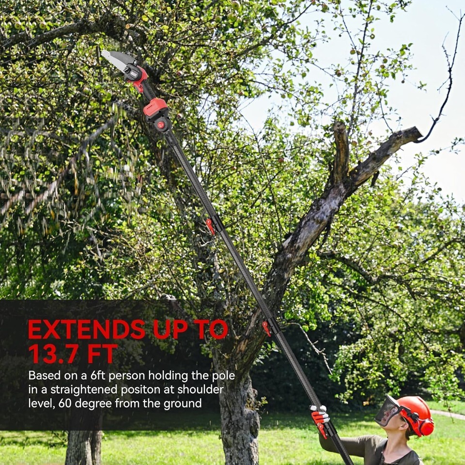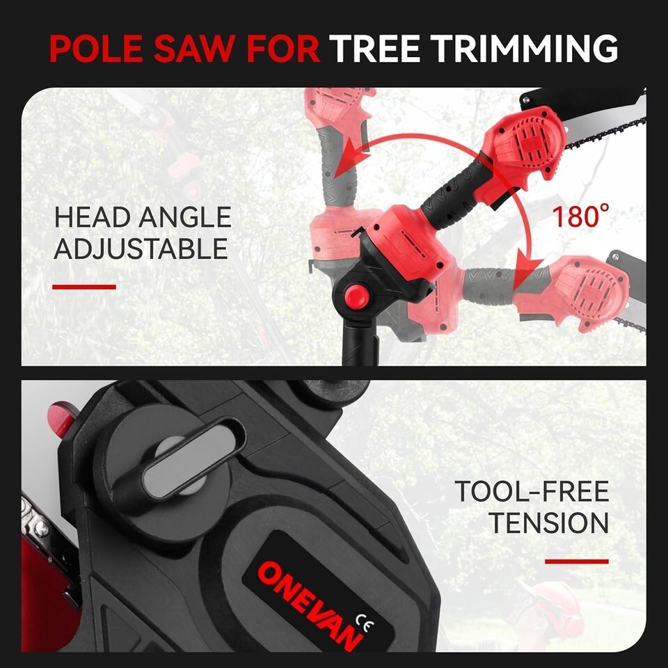 Extends Up To 13.7-Feet Height: When you encounter hard-to-reach branches but don't want to risk climbing a ladder for safety reasons, you should have this cordless pole saw. It can reach up to a height of up to 13.7 feet (based on a 6-foot user holding the pole). And its head is adjustable at an angle of 180, allowing you to easily trim branches in different positions.
