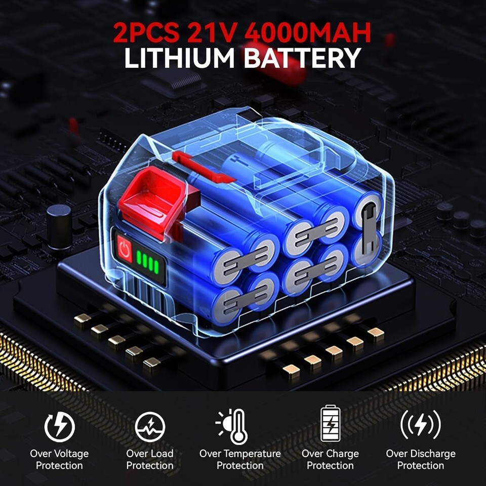 2 Pack 4.0Ah Large Capacity Battery: With two substantial 4000mAh batteries, our cordless pole saw delivers a robust current. Glide through wood up to 2.5 inches thick a whopping 120 times and tackle 6-inch logs 60 times. The rechargeable battery with self-overload and temperature protection provide a much longer battery life.