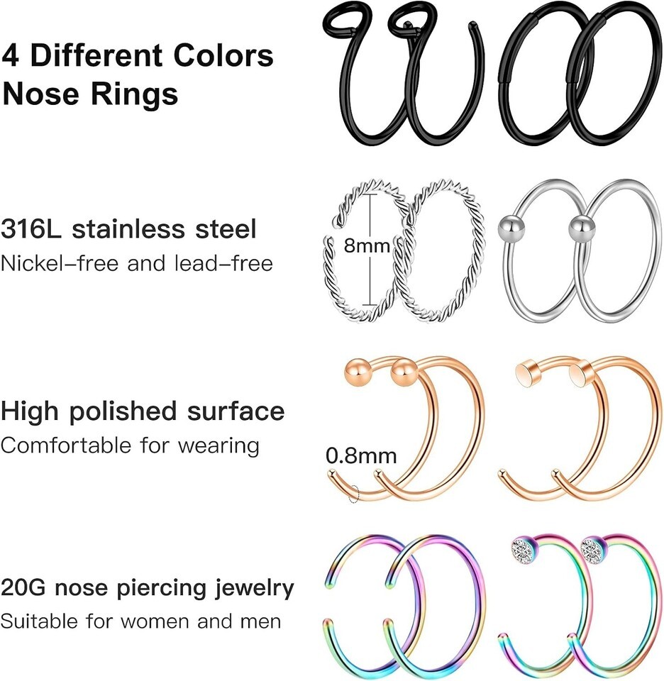These versatile nose rings can effortlessly transition from nose piercings to earring hoops, lip rings, cartilage earrings, and septum rings. Perfect for any occasion, they are a fashionable choice for gatherings, parties, or casual outings.