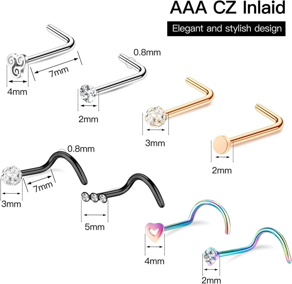 Nose studs are also 20 gauge (0.8mm) with a bar length of 7mm, featuring top sizes of 2mm, 2.5mm, and 3mm.