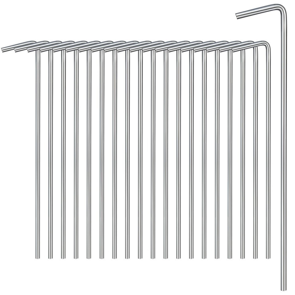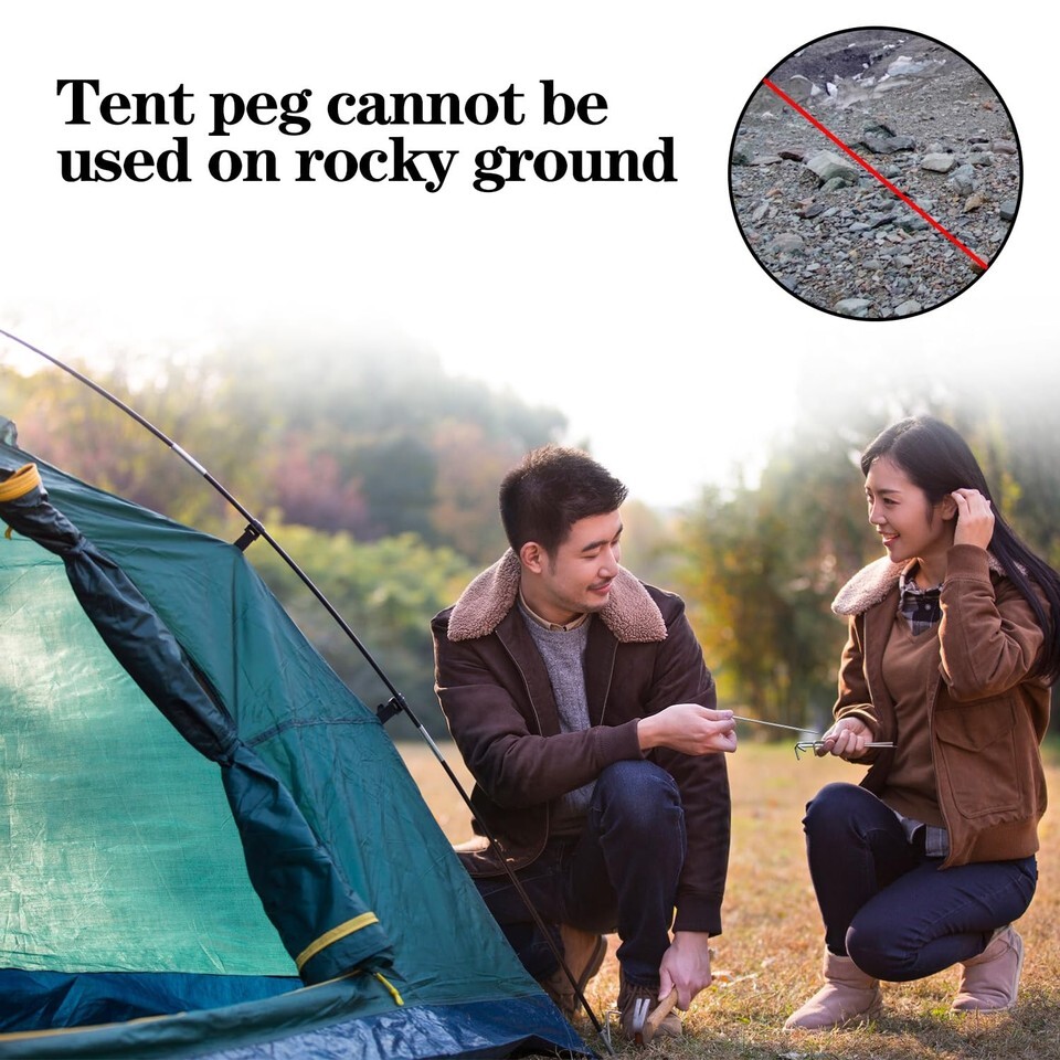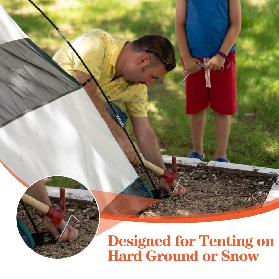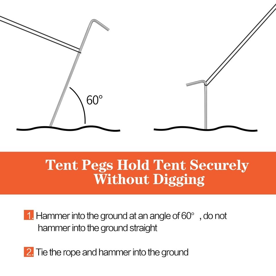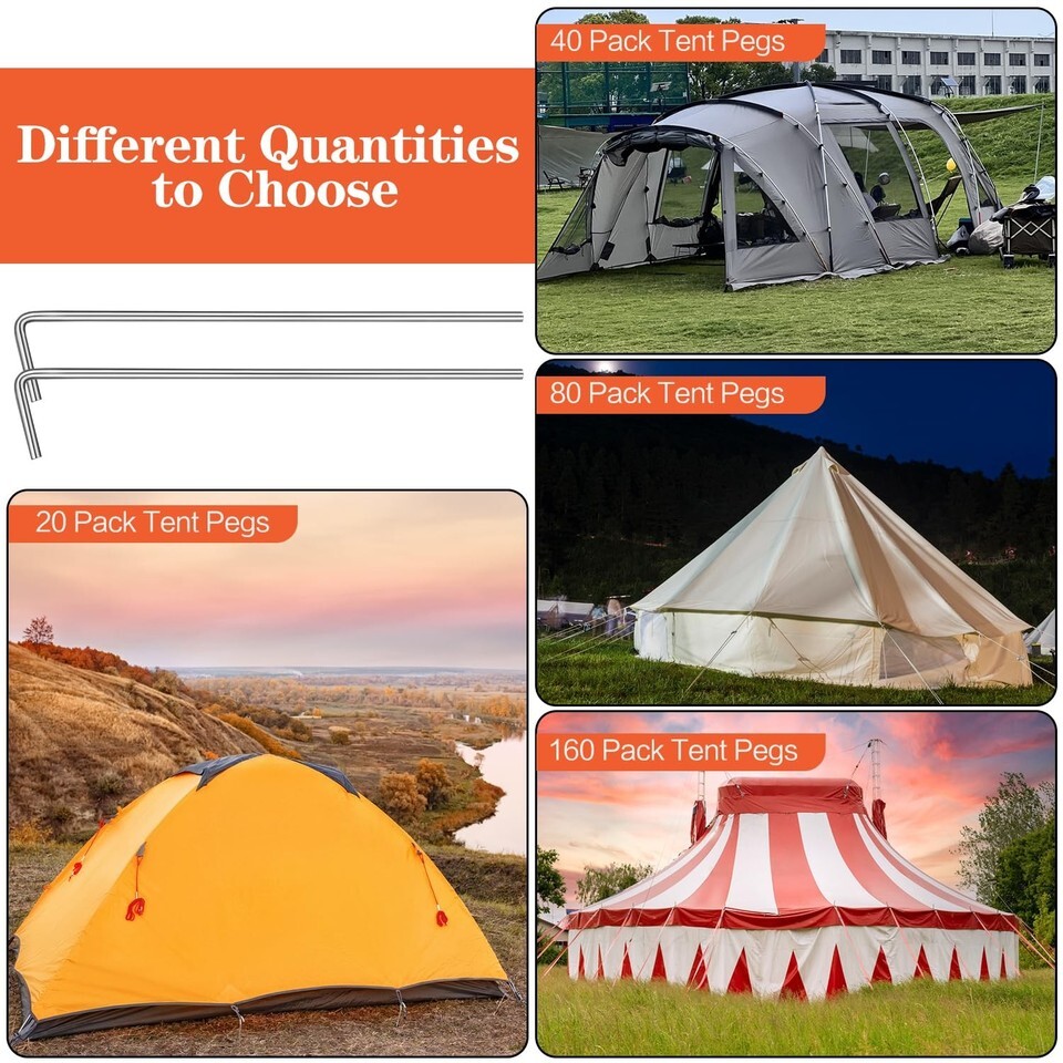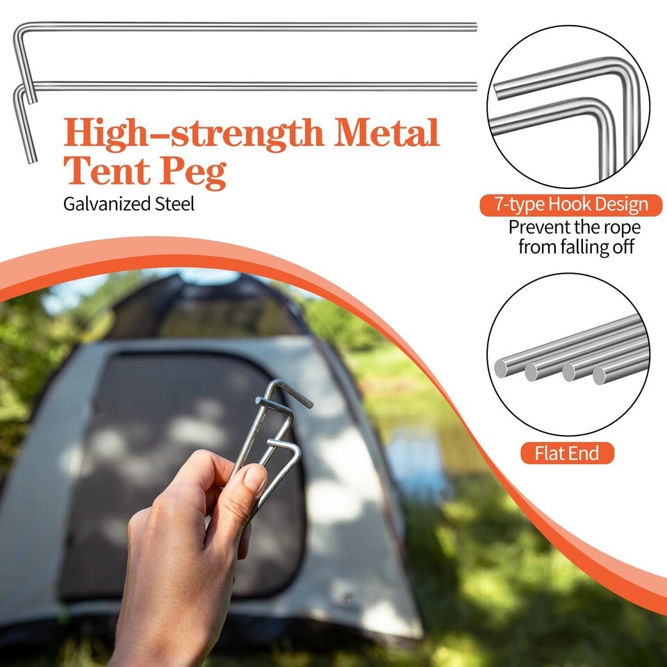 ?Package Include?- The package contains 40 pack of tent pegs, the length is 7", the diameter is 5/32". It is very easy to use and strong. It is designed for pitching tents on hard or uneven ground. Note: It cannot be used on rocky ground. ?7-shape Design?- The overall shape of the tent pegs is a 7-shape, which has a large contact area with the ground and a firmer grip. Use your hands, feet or a hammer to drive the sharp side into the ground or lawn to ensure that it is firm and will sink into the ground for greater safety. ?Durable Material?- The tent peg is made of rust -proof and durable galvanized steel. It is strong enough to be fixed on the ground, and the rust -proof and fixed force are very strong. ?Metal Tent Peg?- The weight of each tent peg is only 0.6oz/18g. It is very convenient to carry when going camping, and it is not heavy to carry. ?Wide Application?- Tent pegs are perfect for securely anchoring tents, canopies, tarps or landscape trim and so on.