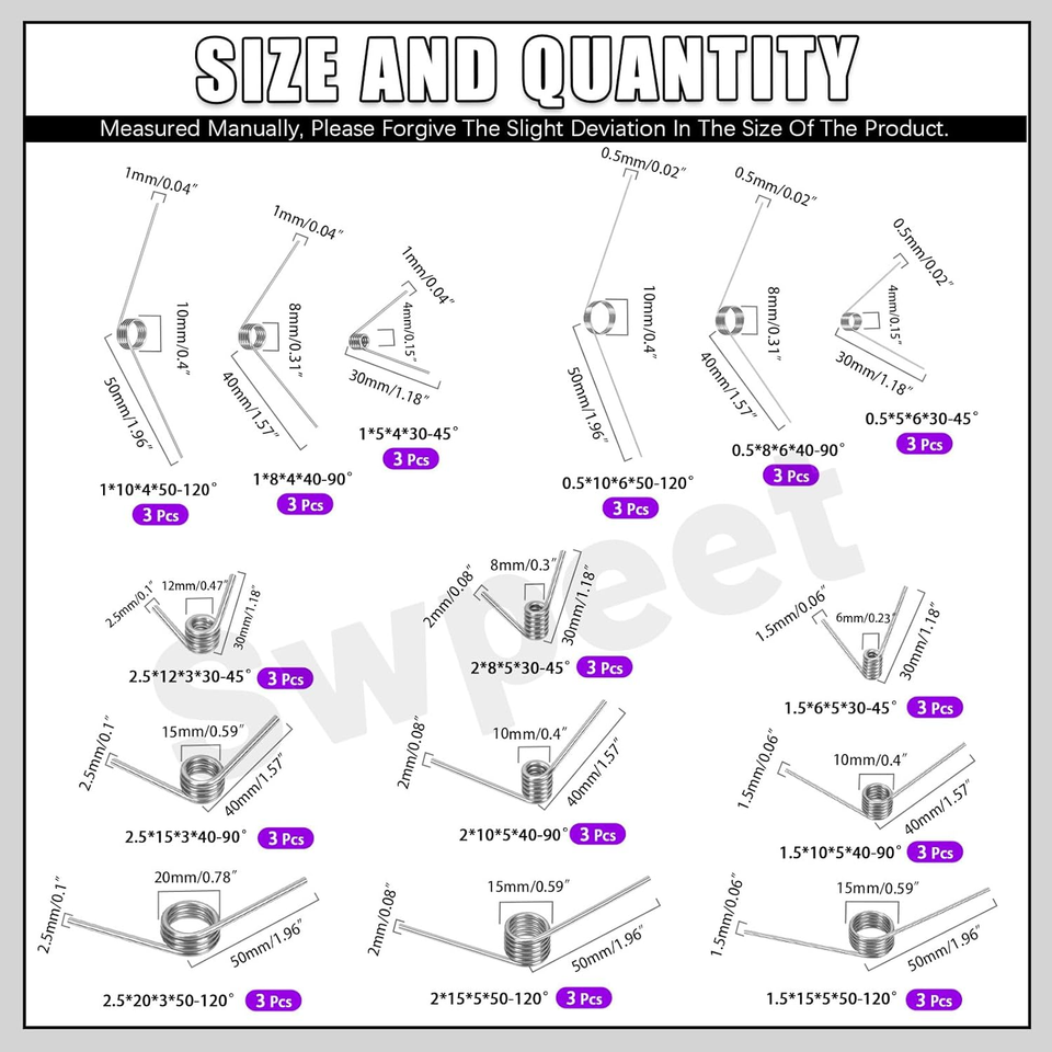 ? Comprehensive Kit: The Swpeet 45-Piece Stainless Steel Torsion Springs Assortment Kit includes a diverse collection of 15 different sizes of stainless steel torsion springs, each designed with precision for various applications. With three pieces of each size available, this assortment is perfect for meeting your maintenance and repair needs in everyday projects.