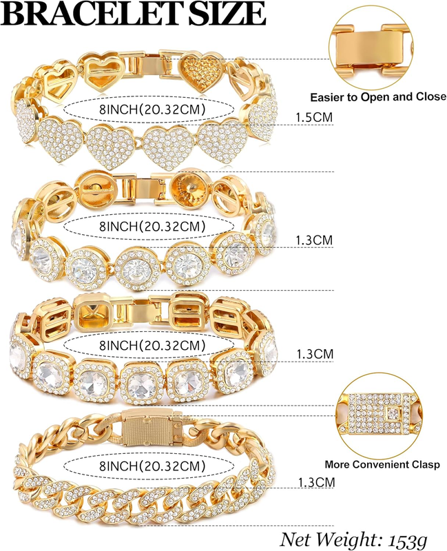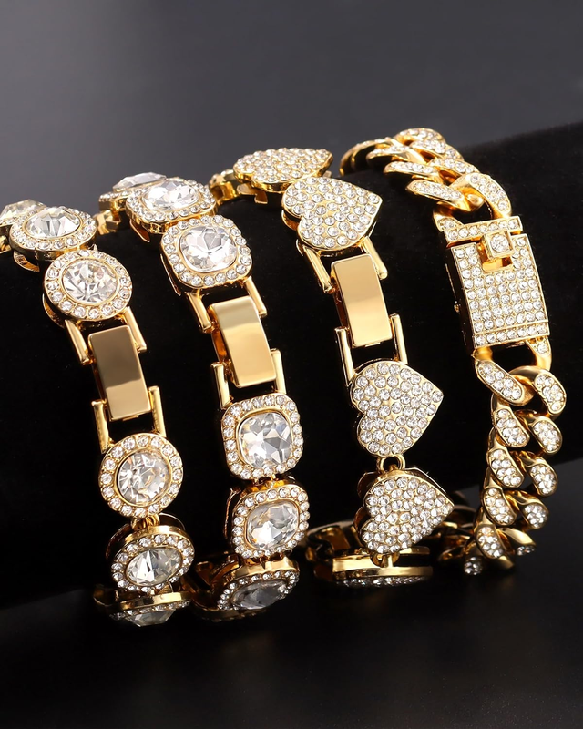 Each women tennis bracelets has more than 500 sparkling rhinestones, hand-inlaid cuban chain bracelets, total number of crystal exceeds 2000, the gold color chain bracelets have enough sparkling rhinestones to catch the eye.