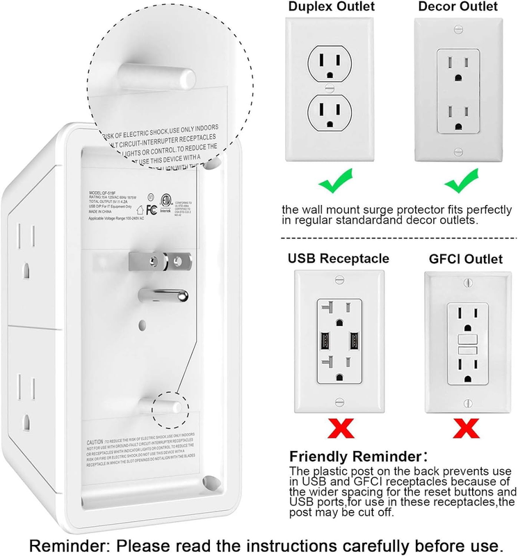 Wall Mountable Design: Just plug the surge protector into a standard grounded duplex wall receptacle and if you want secure it on duplex outlet just need a screw driver to use the screw included then you don't need worry about falling off.