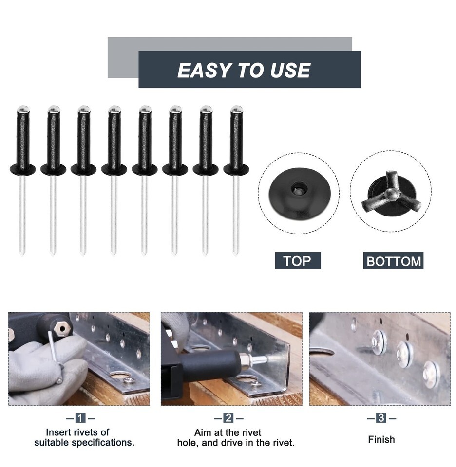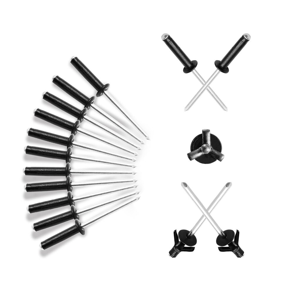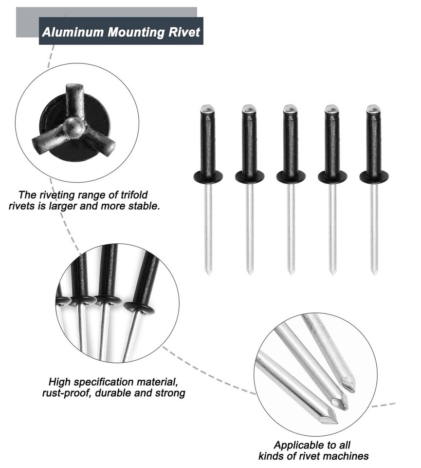 Package Details: You will get 50 rivets with a diameter of 3/16 inch / 4.8 mm, a grip length of 1 inch / 25 mm, and a rivet range of 3-4 mm. To avoid mistakes, be sure to confirm the size when purchasing Quality Assurance: Pop rivets made of quality aluminum are corrosion-resistant, rust-resistant, durable and well-stressed. Even if it is used in harsh environments such as deep water, the working effect will not be weakened. Definitely a reliable good rivets Practical Design: After the shaft of the trifold rivet is pulled off with a rivet tool (not included), the tri-fold rivet explodes and expands to form three anchor points in different directions. Because there are multiple stress points, it will have better fixing force and stronger stability than ordinary rivets Wide Application: The aluminum rivet is very practical and has a much wider range of applications than you might think. You can use it in cars, buildings, containers, ships, kayaks. Not only that, you will also see them in the ocean, furniture appliances, plumbing systems, lever handles, etc