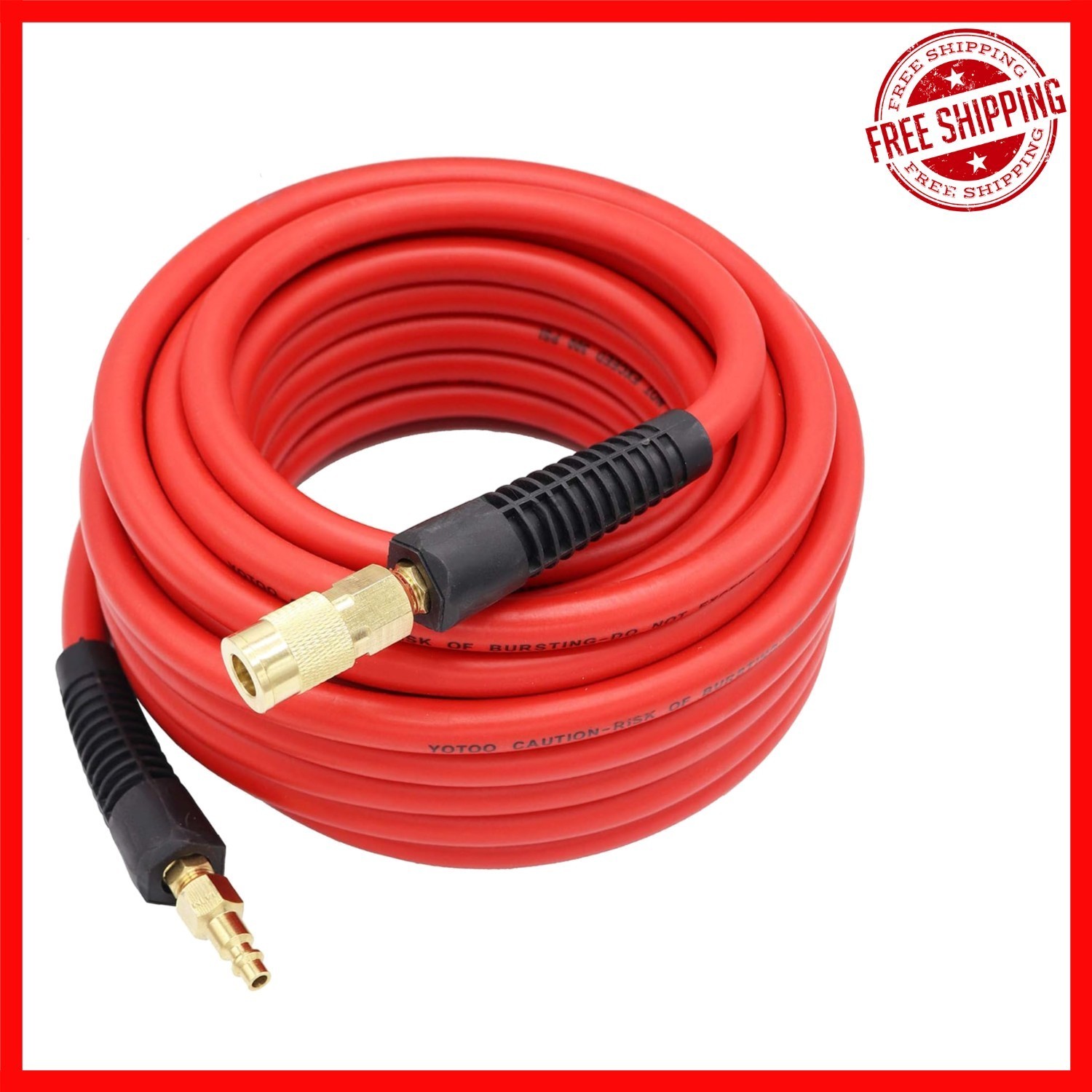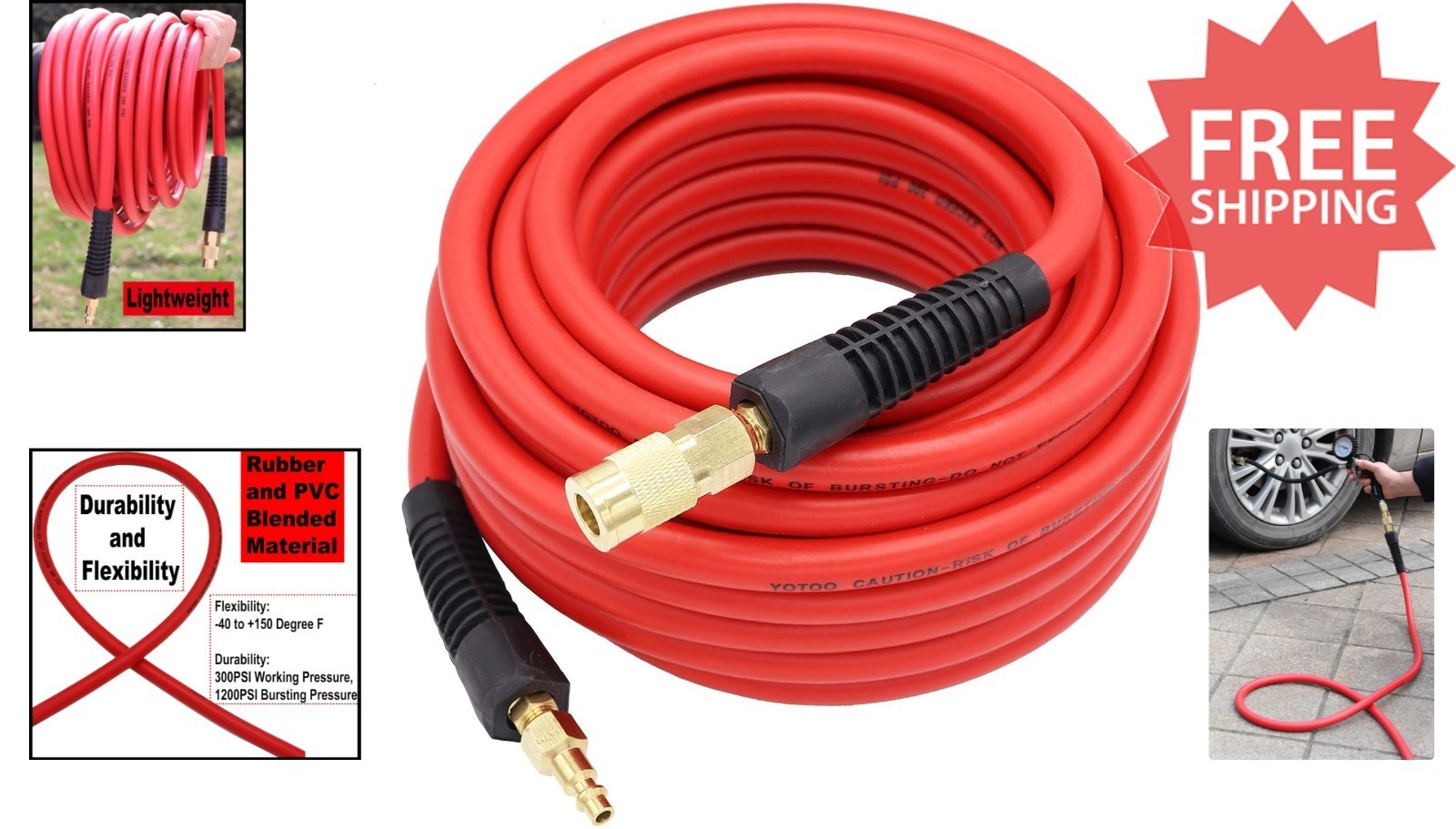 Upgrade your air tools with this heavy-duty, lightweight air hose crafted from a durable blend of rubber and PVC. Designed for all-weather resilience and abrasion resistance, it offers exceptional flexibility and longevity. Equipped with 1/4? industrial NPT fittings and quick couplers, it connects seamlessly to your air compressor and tools without the need for additional fittings. Both ends feature bend restrictors to prevent kinking and extend hose life. With a 3/8-inch inner diameter and 50-foot length, it supports a maximum working pressure of 300 PSI and a bursting pressure of 1200 PSI. Enjoy peace of mind with a two- limited . To ensure fast and reliable delivery, we work with multiple fulfillment partners and suppliers. Depending on availability and location, your order may ship from different warehouses or arrive in packaging that varies from item to item. Tracking details are typically provided shortly after shipment, and customer satisfaction remains our top priority. Please note that due to carrier policies and regional regulations, certain items may not be eligible for delivery to specific states or territories.