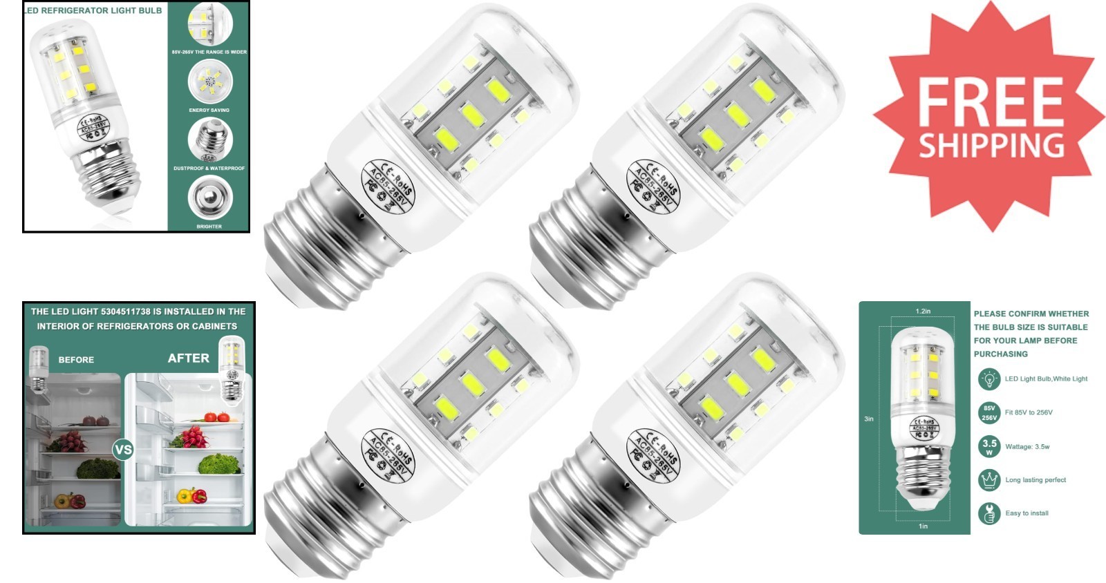 Upgrade your refrigerator lighting with our 4-pack of 5304511738 LED Refrigerator Light Bulbs, a reliable manufacturer substitution designed to fit a wide range of models. These energy-efficient bulbs emit bright, soft white light (3.5W, 400 lumens) with a high color rendering index (Ra 80), ensuring true color clarity inside your appliance. Compatible with numerous brands including Frigidaire, Kenmore, and Electrolux, and featuring an E17 medium base, these bulbs are ideal for refrigerators, freezers, bathrooms, and bedrooms. Made from durable ceramic and PC materials for stylish appearance and excellent heat dissipation, they provide a cost-effective, long-lasting lighting solution. Enjoy hassle-free use with wide voltage compatibility (AC100-265V) and significant power savings. If you're unsure about compatibility, our dedicated support team is ready to assist you.