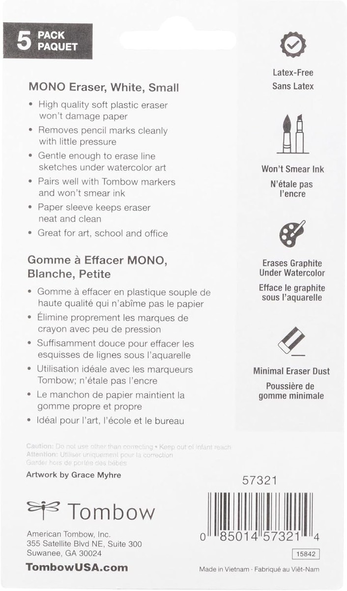 57321 MONO Eraser, White, Small, 5-Pack. Cleanly Removes Marks Without Damaging