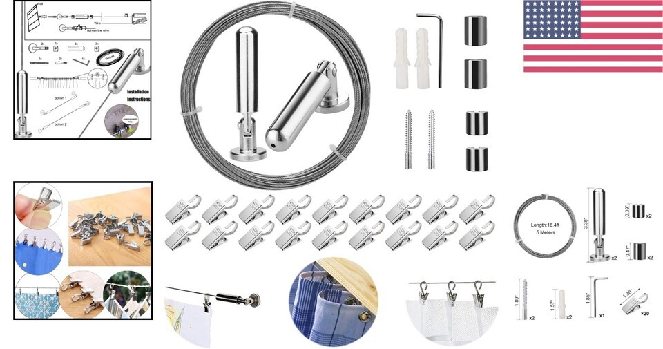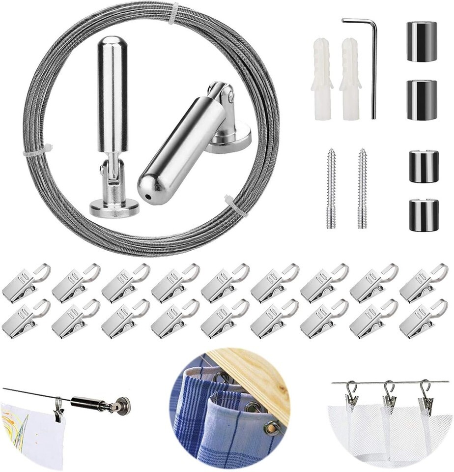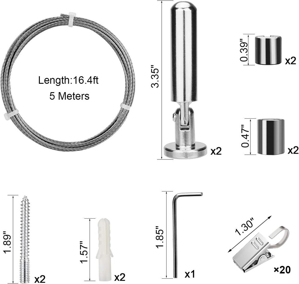 Items Included: Curtain Clips,Curtain Hanging Wire Rod,Mounting Brackets,Hanging Clips,Zinc Anchors,Screws,Fasteners