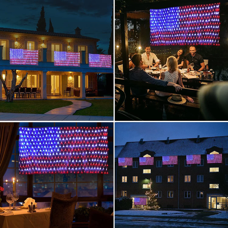 6.6ft x 3.3ft American Flag Net String Light is a Perfect Patriotic: Decorations for The Home The unique design of this flag light shows your patriotism and can be used memorial day decorations, 4th of july decor, independence day decor and other festivals. You can also hang the product and tile it on walls, trees, windows and wherever you want.Upgraded Super Larger Size: This American flag lights outdoor has 420 super bright LED and the size is 6.56ft * 3.28ft/2m 1m . It can be seen clearly even from a distance, and you can enjoy it with friends and neighbors.Safe Easy to Install: The power adapter has passed UL certification.This lights directly plug in and unplug it for power on and off.IP44 Waterproof: This light is IP44 Waterproof, suitable for both indoor and outdoor use(adapter is not waterproof,it should be covered with waterproof materials when used outdoors)Low power consumption:The product uses bright LED low-energy-consumption lights, which can greatly save costs and extend service life.